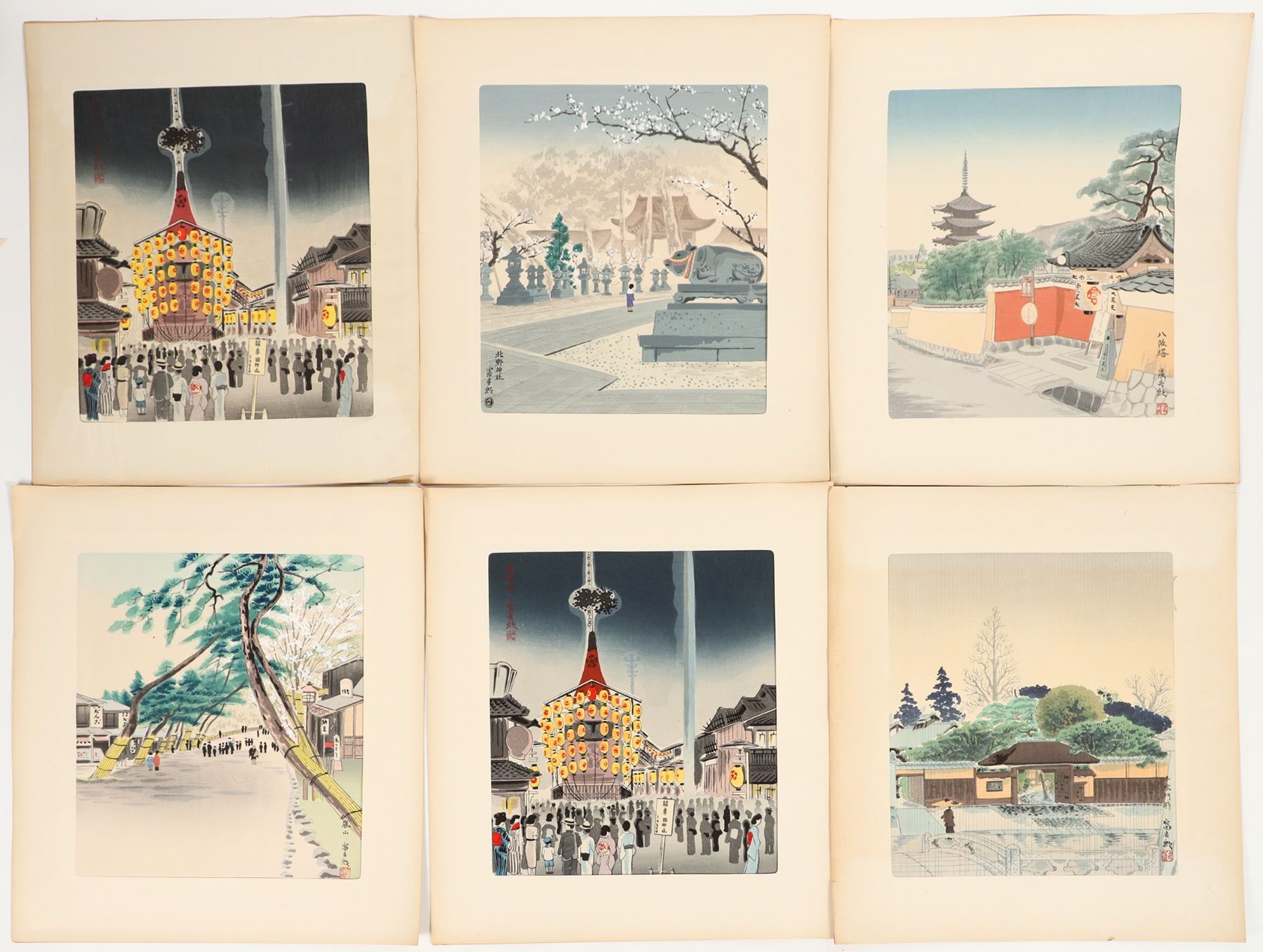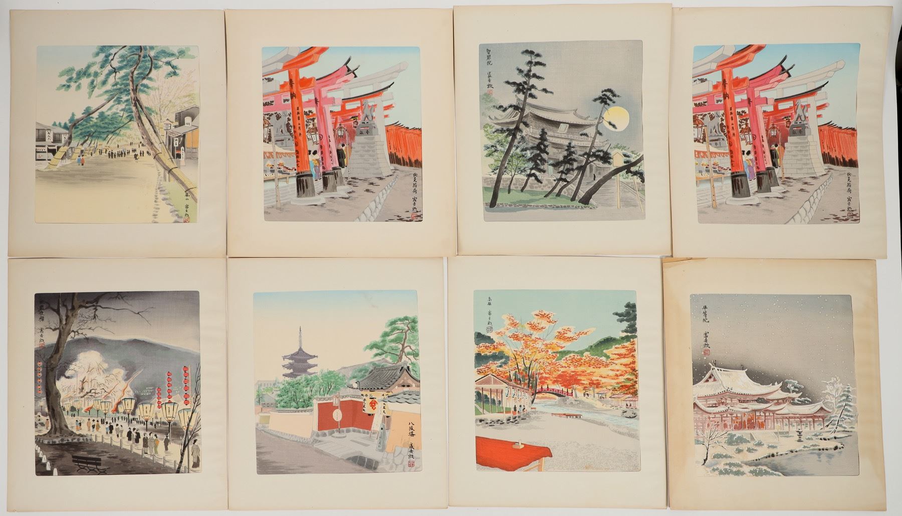 Twelve Months of Kyoto c.1945 by Tomichiro Tokuriki (1902-1999) Tokuriki was a renowned Japanese printmaker. This group contains portions of what must have been, three different printing of the same set. Of the original 12, only #1 and #12 are missing. Included in a 4 page folio information pamphlet in English regarding the making of Japanese prints by Uchida, the publisher of the prints. This group has 18 original prints, each of which appears to be very popular in online art markets.