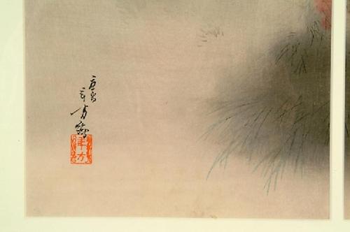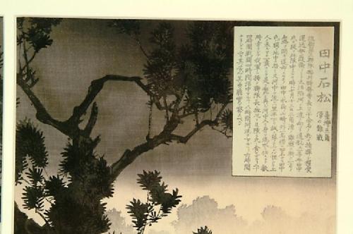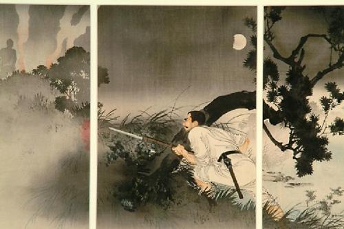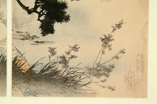 (Japanese c. 1920) hand colored woodblock with solider figures, inscription and mark on right panel, 13 1/2" by 8 1/2" each.