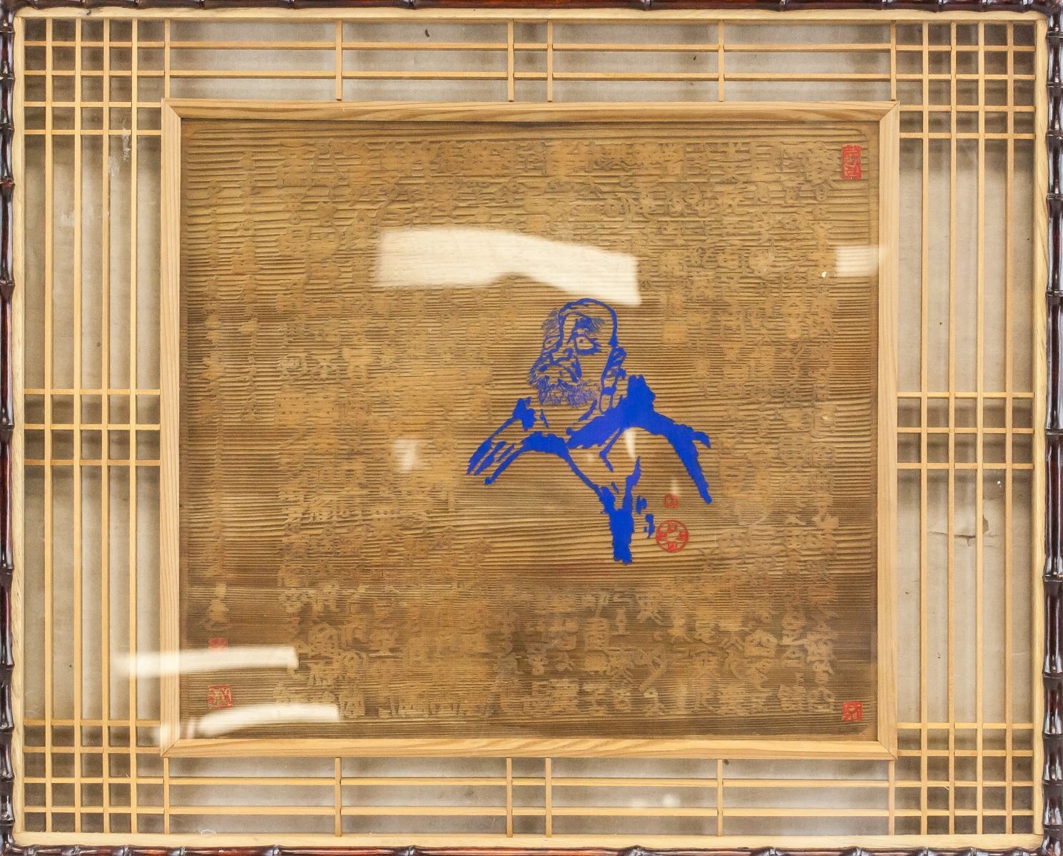 Carved wood, framed. Featuring Japanese woodcarved calligraphy and lohan with seals. 48 x 58 cm, Frame: 51 x 62 cm. PROVENANCE: Richmond Hill Estate
