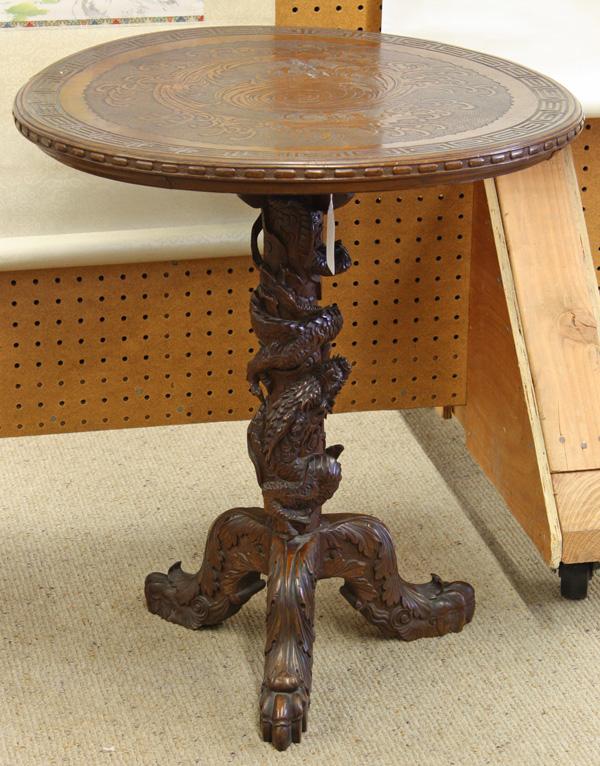Japanese export carved wood tea table, Meiji/Taisho period, the circular top carved with swirling waves on a granulated ground in low relief framed by a key-fret band, set above a pedestal base entwined by a dynamic dragon in high relief (repairs), 25.3''h x 22.5''dia