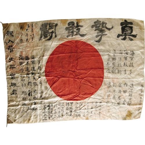<B>Japanese World War II Autographed Battle Flag.</B></I> This was the personal flag of an important Japanese shipbuilder named Ohira Tomio who received it upon his induction into the service in August 1940. It is signed by numerous individuals including several high-ranking Naval shipbuilding officers. The flag is the familiar Hinomaru or "rising sun" design with a red disc against a white background and is approximately 36" x 27" in size. The condition is fine with a bit of soiling and storage folds. Included is a typewritten translation of the names and text on the flag. An excellent item for further research and display.