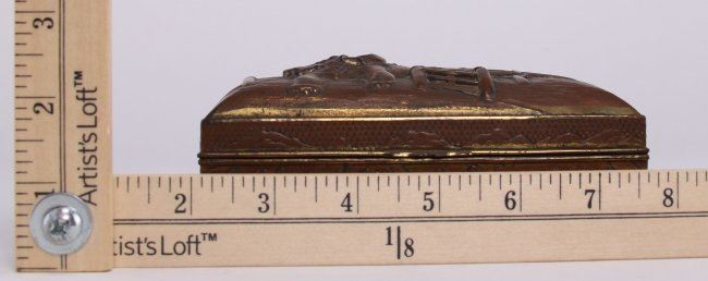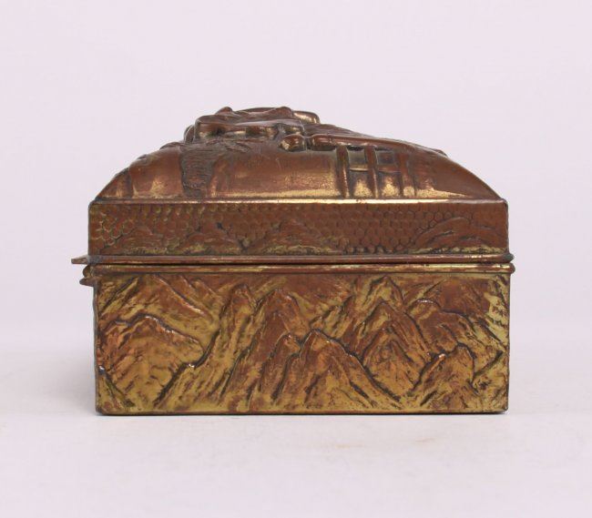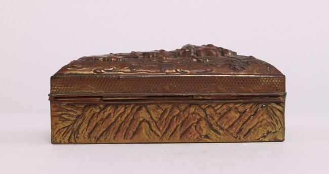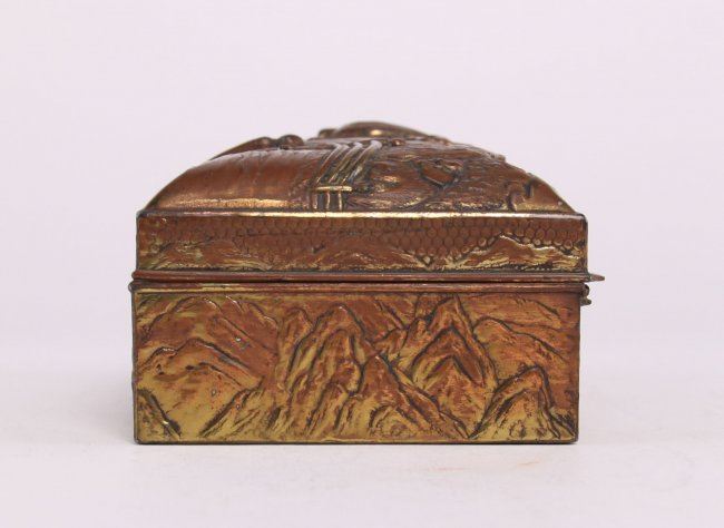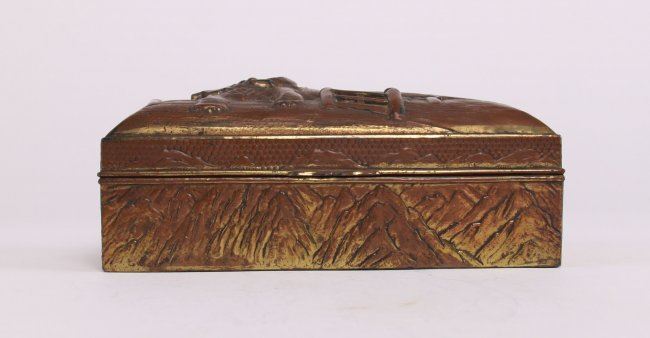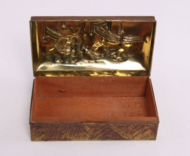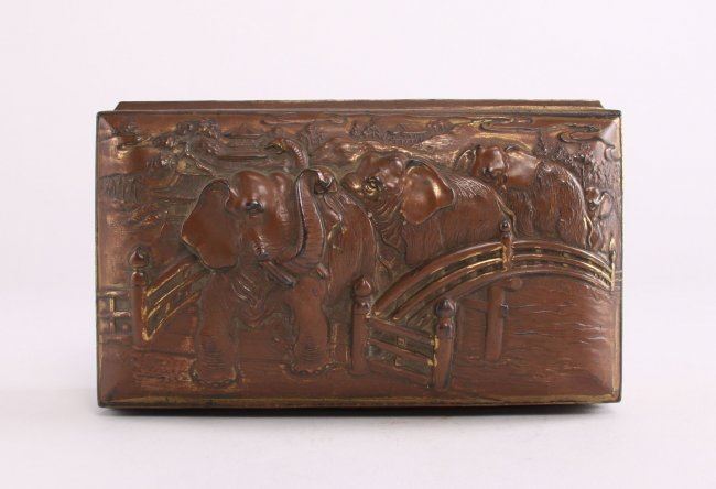 Japanese brass/copper box with high relief of elephants. (Size: See second photo for measurement.) Photos are part of the description representing the condition report. Pangaea Auctions urges Bidder's to view all attached photos.