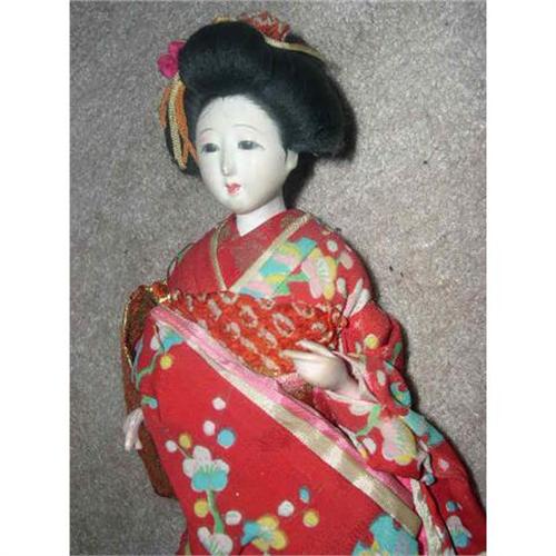 This is a doll from Japan. This doll is 11" form the head to the bottom of the kimono. She has her original wig which has decorations in it. She has some blackpainted brushstrokes around her face and and in the back. She has glass eyes and one tiny spot of paint off the nose. She is nice and clean. No rips or slits in the kimono. I do think that the light pink was a darker pink so that means there is some fade. The doll has no legs and was made to be just a sitting doll. She has the thumb broken off the doll's right hand. She is from a smoke free enivornment. If you can love her, please bid. Buyer to pay $10 for U.S. shipping, insurance, and handling. Thanks for viewing.