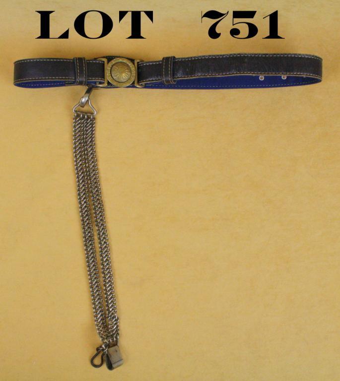 Japanese lined leather sword belt with brass two piece cast buckle and attached nickel plated sword hanger and chain in overall good condition; leather is black color and interior lining is a royal blue. Est.:$75-$150.