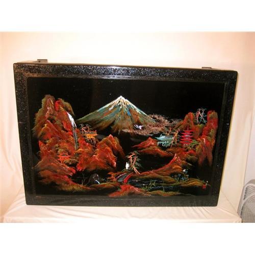 Beautiful antique Japanese low table who can be use as a tee table ,is in wod black lack the top is hand painted with a Japanes landscape of a Fujiyama mountain,is with mothepearl inlaid also.Signed at the bottom right