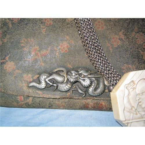 This is and very fine and unusal piece the leather is painted with birds and on the inside thier is a silver clasp.. The dragon is in silver on the front and the netscke is of a man and a monkey, as you can see this is of fine and rare quality.