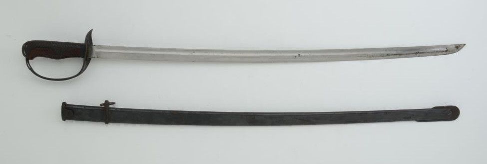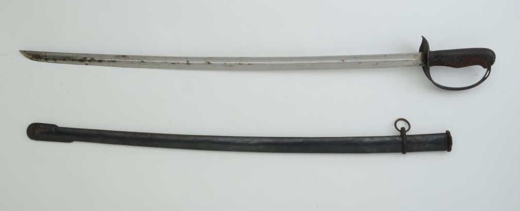 Japanese military Cavalry sword and metal scabbard, circa 1937 in overall good condition showing some spots of erosion on the blade, checkered wood grip; metal scabbard is good with some old dents. Est.: $100-$200.