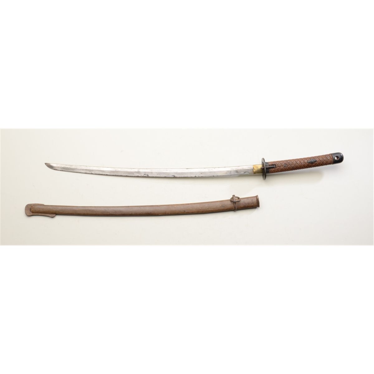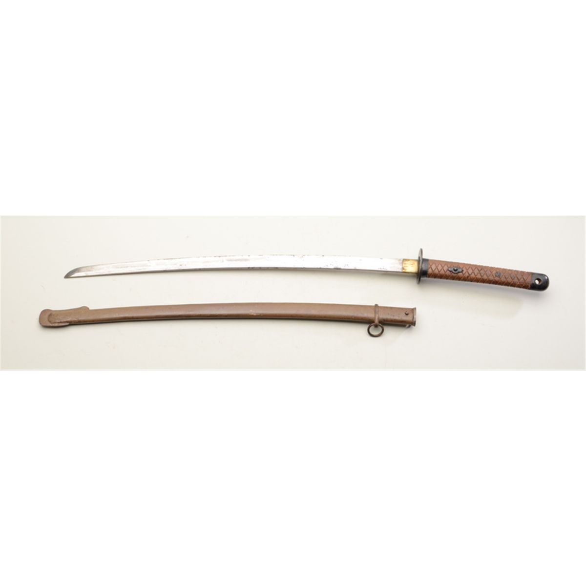 Japanese military sword and scabbard circa WW II, in overall fair uncleaned condition; blade is numbered 215498; simple mounts, checkered wood grip. Est.: $200-$400.