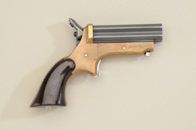 Japanese modern copy of a Sharps four barrel derringer, .22 cal., blued barrels, brass frame, composite grips, #5127 in overall fine condition with black leather holster. Est.: $75-$150.