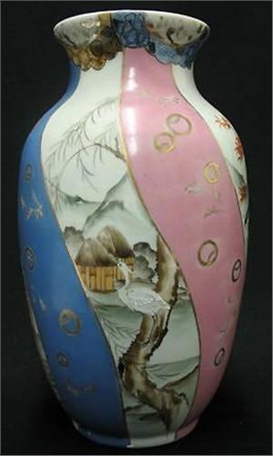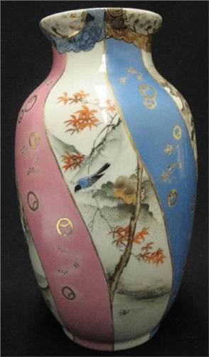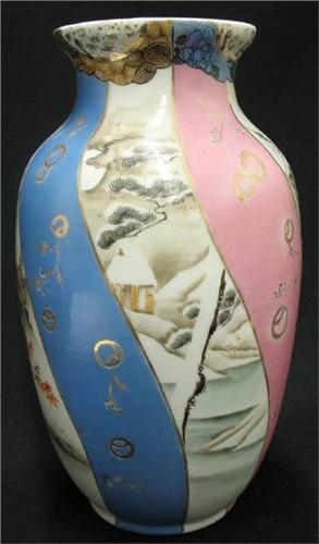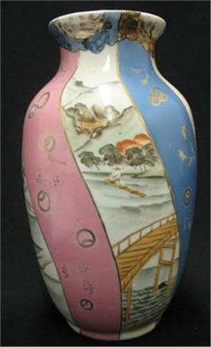 Japanese porcelain vase; alternating panels depicting the four seasons; stylized decoration around rim; signed on base; 19th C. measures 12" high x 7" diameter (chip on glaze under bridge)