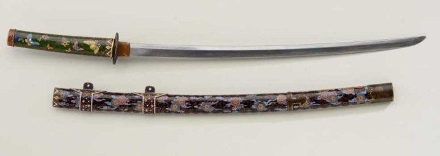 Japanese samurai style sword with elaborate 19th to early 20th century cloisonné enamel mountings in multi colors showing butterflies and stylized crests. The sword measures 39” overall with 26-1/4” blade. The blade is oil tempered and of 20th century. The sword is mounted with a iron and gold inlaid tsuba which is nicely pierced and shows a figure of samurai in armor. The blade is in good condition. The mounts arein very good plus to near fine condition with simple brass accents. These works of art were favored by merchants and courtesans and worn as jewelry and a sign of wealth. Est.;$5,000-$10,000.