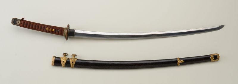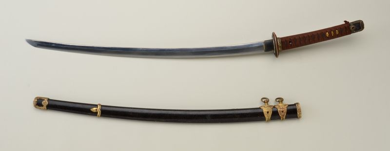 Japanese samurai sword and scabbard approx. 39” overall with an approx. 27-1/2” blade in overall very good condition with two menuki and cord wrapped ray skin grip; simple tsuba; nice mounts on scabbard; should be furtherresearched. Est.: $600-$1,200.