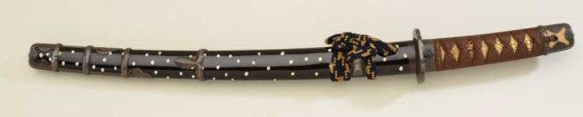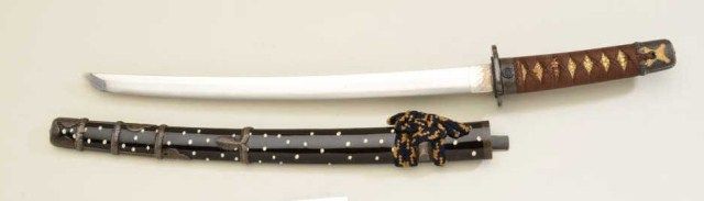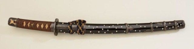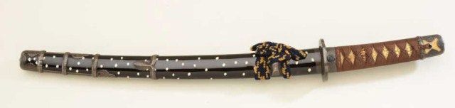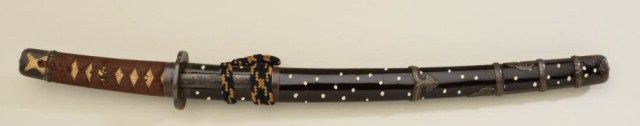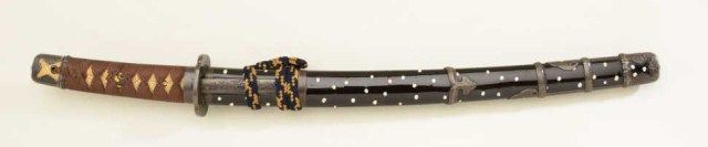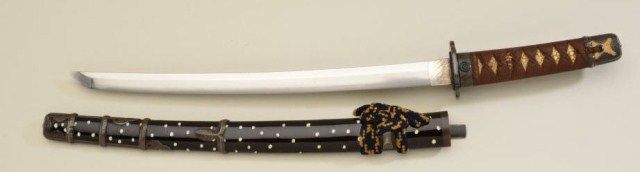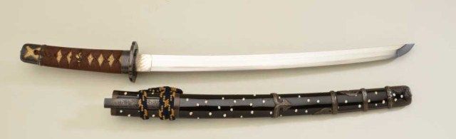 Japanese wakasashi or medium size sword with old handmade blade and fine silver mounts with decorative lacquered scabbard. The sword shows a good wrap to the handle with quality menuki with matching kozuka knife totsuba which shows same mon or royal crest. The tang is unsigned with one hole and dates 150-300 years old judging by the rust and file marks. The hibaki is silver with detailed file marks. The blade shows analmost straight temper and is in almost very good condition and temper extends around tip. The scabbard shows fancy engraved silver re-enforcements at its ends. A quality Japanese sword with fine mounts belonging toa personage of rank. Est.;$4,000-$8,000.