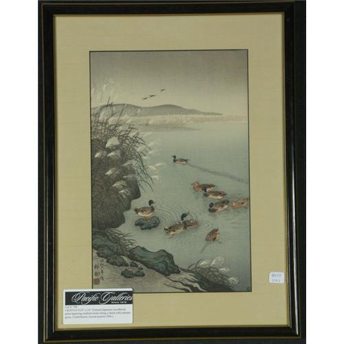UKIYO-E 9.25'' x 14'': Framed Japanese woodblock print depicting mallard ducks along a shore with pampas grass. Unattributed, second quarter 20th c.