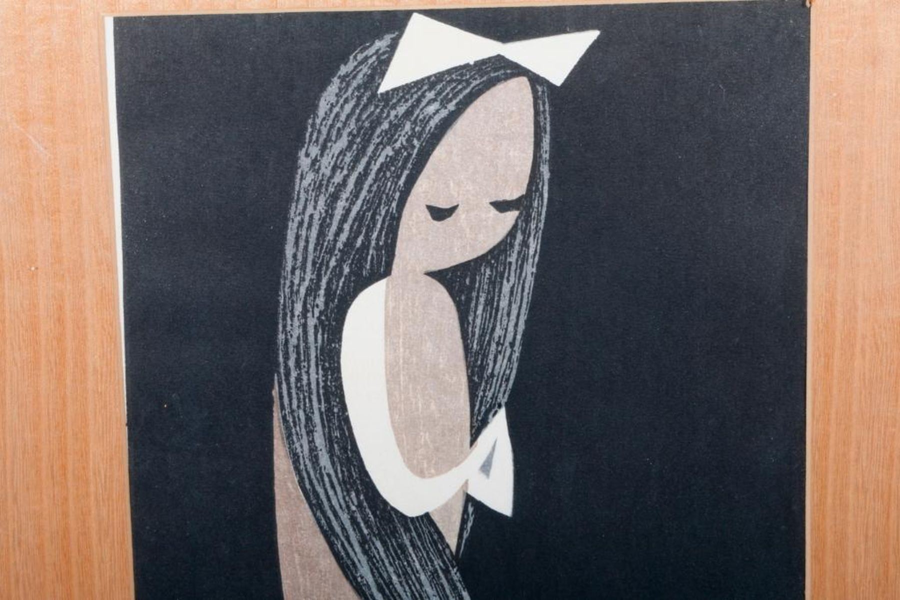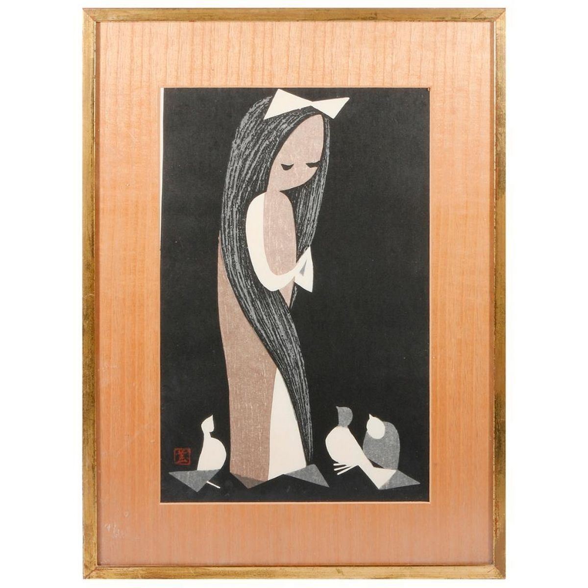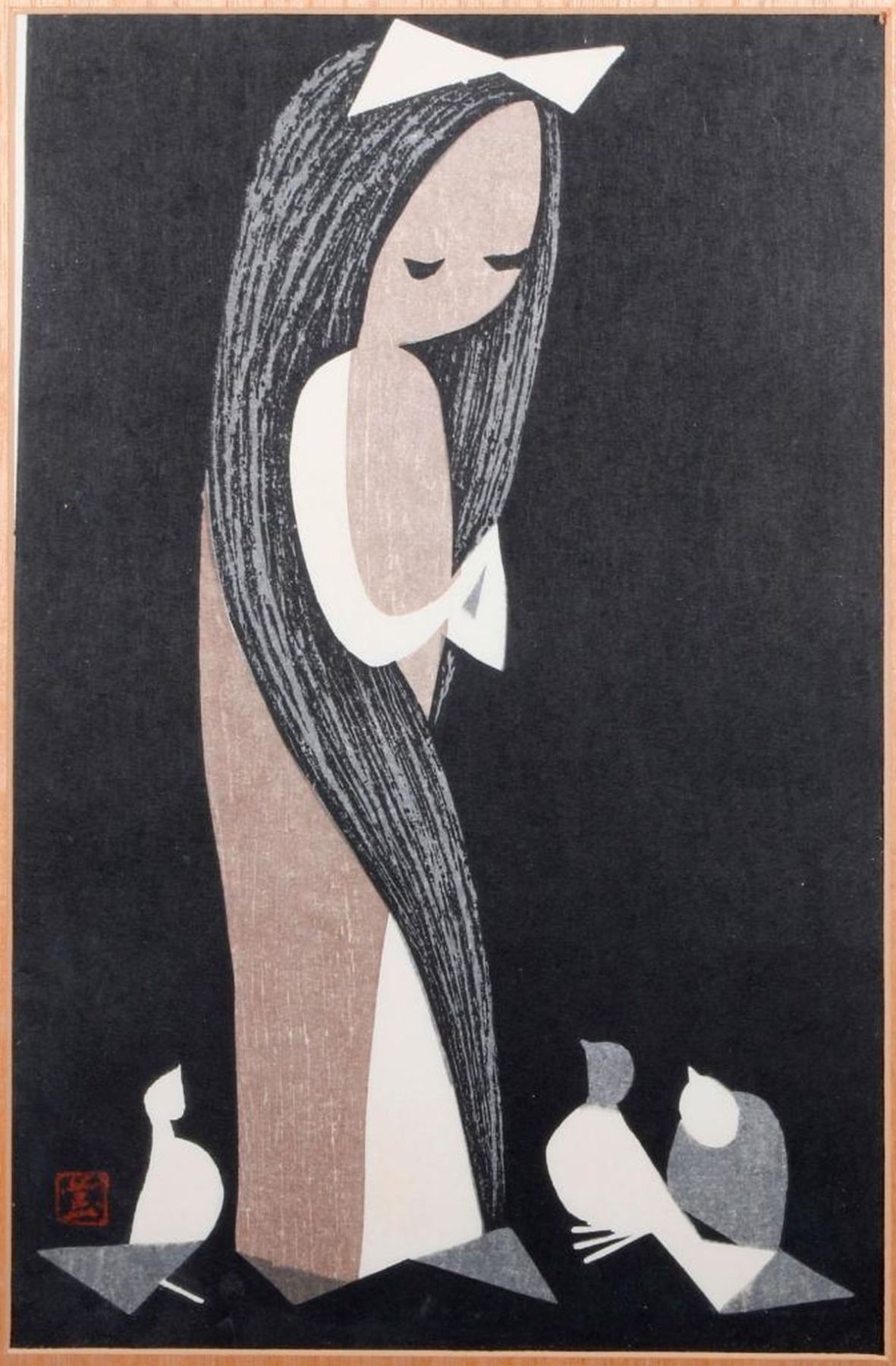 A 20th century Japanese woodblock print of a girl feeding birds. Image measures 14 inches high x 9, frame 19 3/4 inches high x 15.