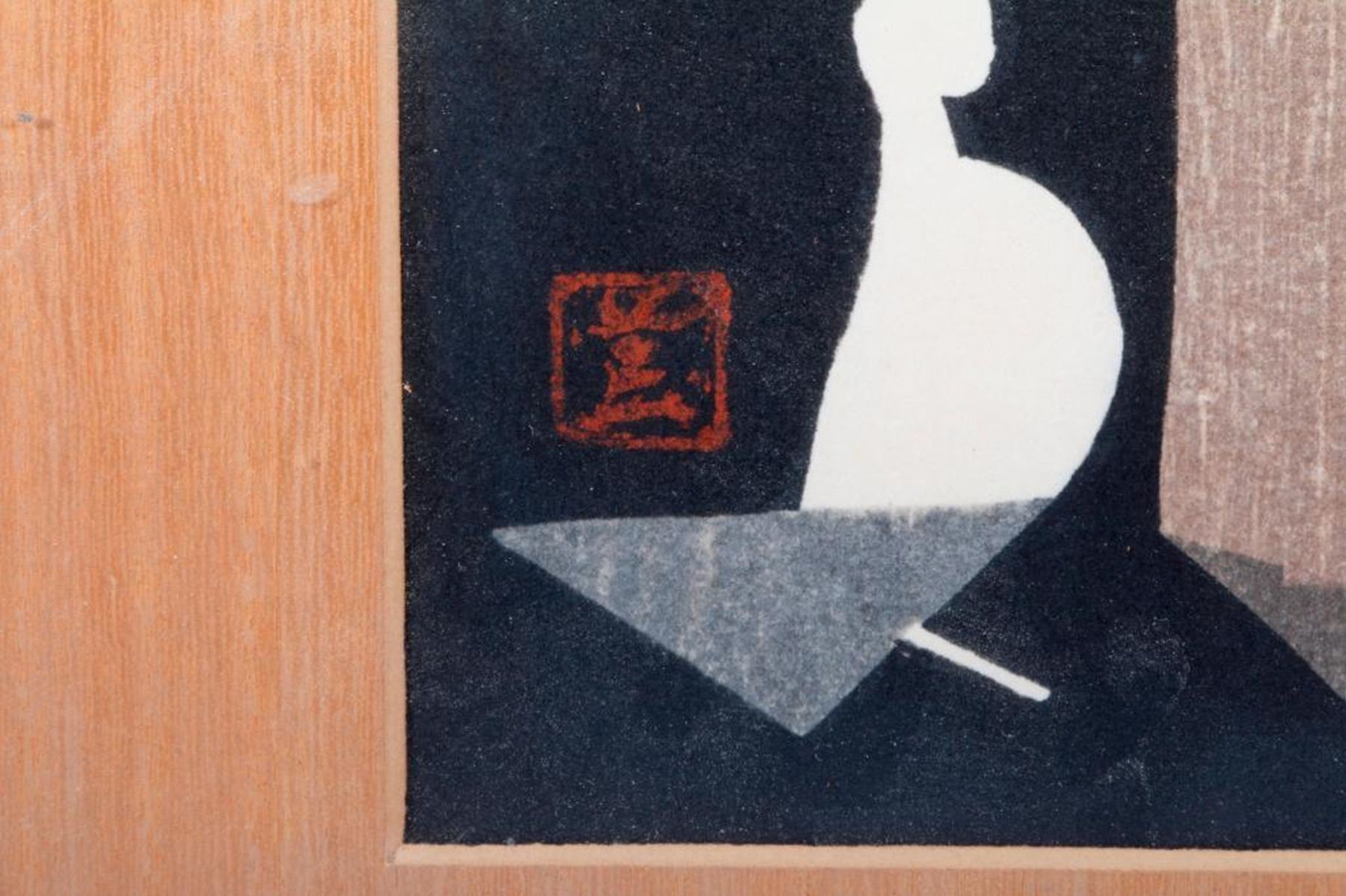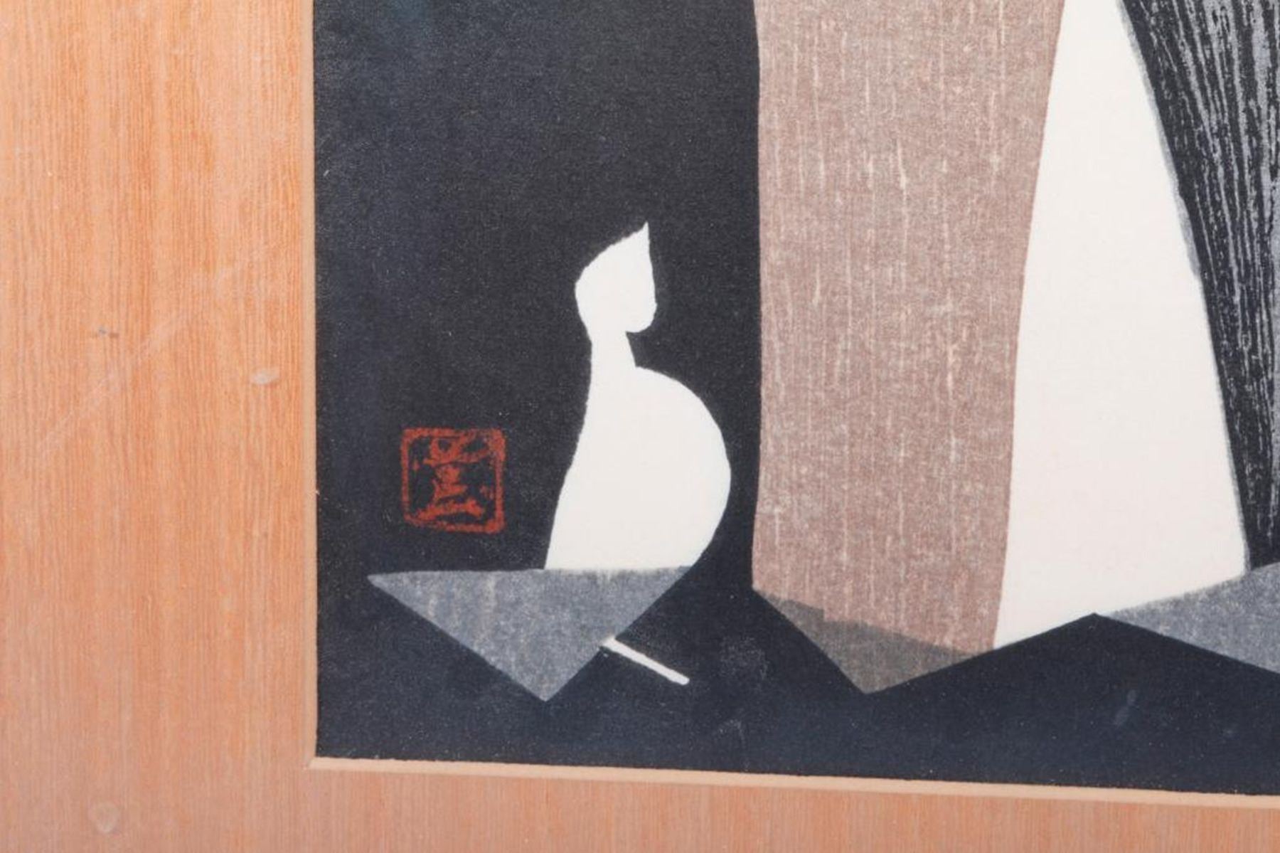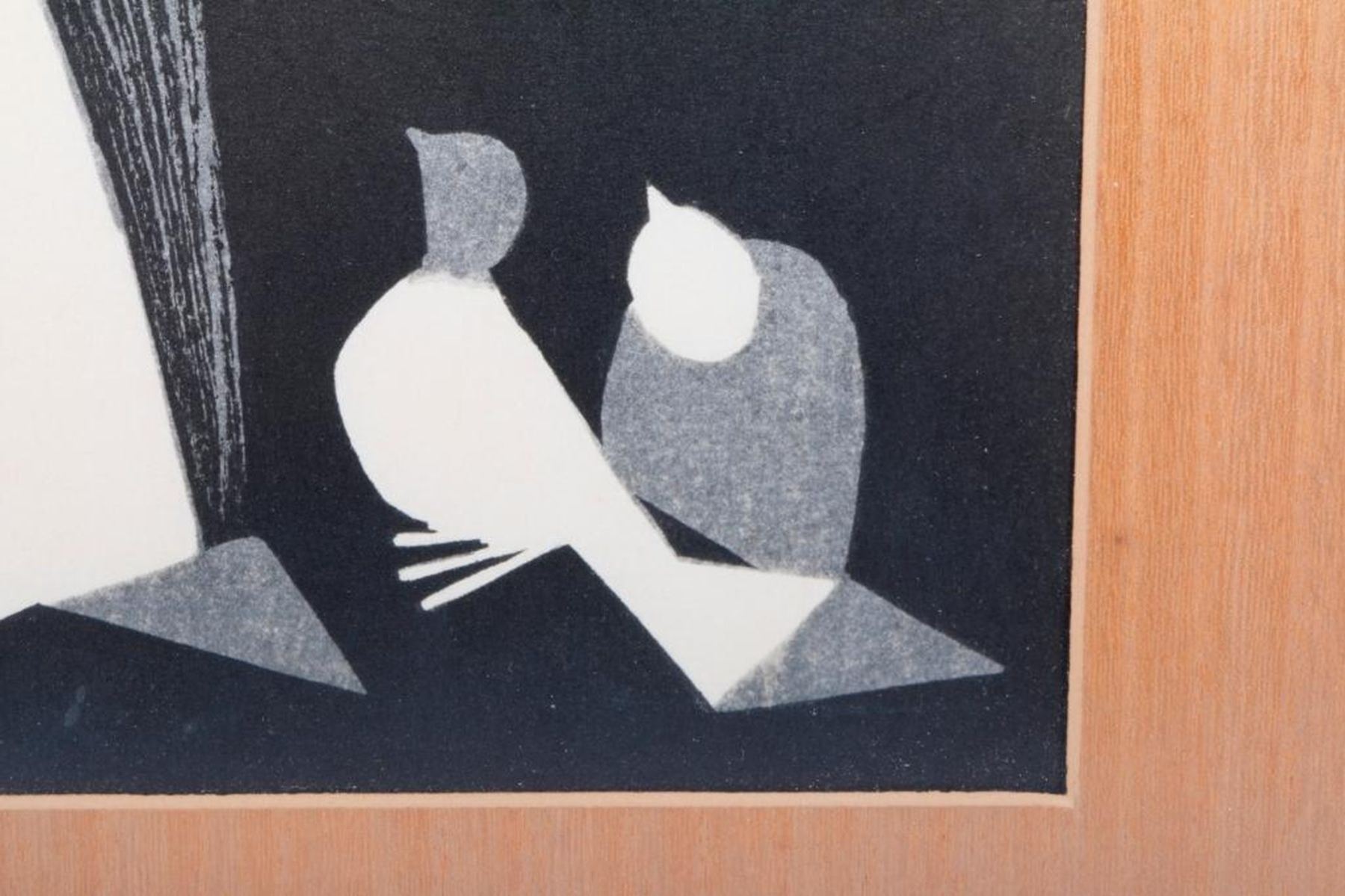 A 20th century Japanese woodblock print of a girl feeding birds. Image measures 14 inches high x 9, frame 19 3/4 inches high x 15.