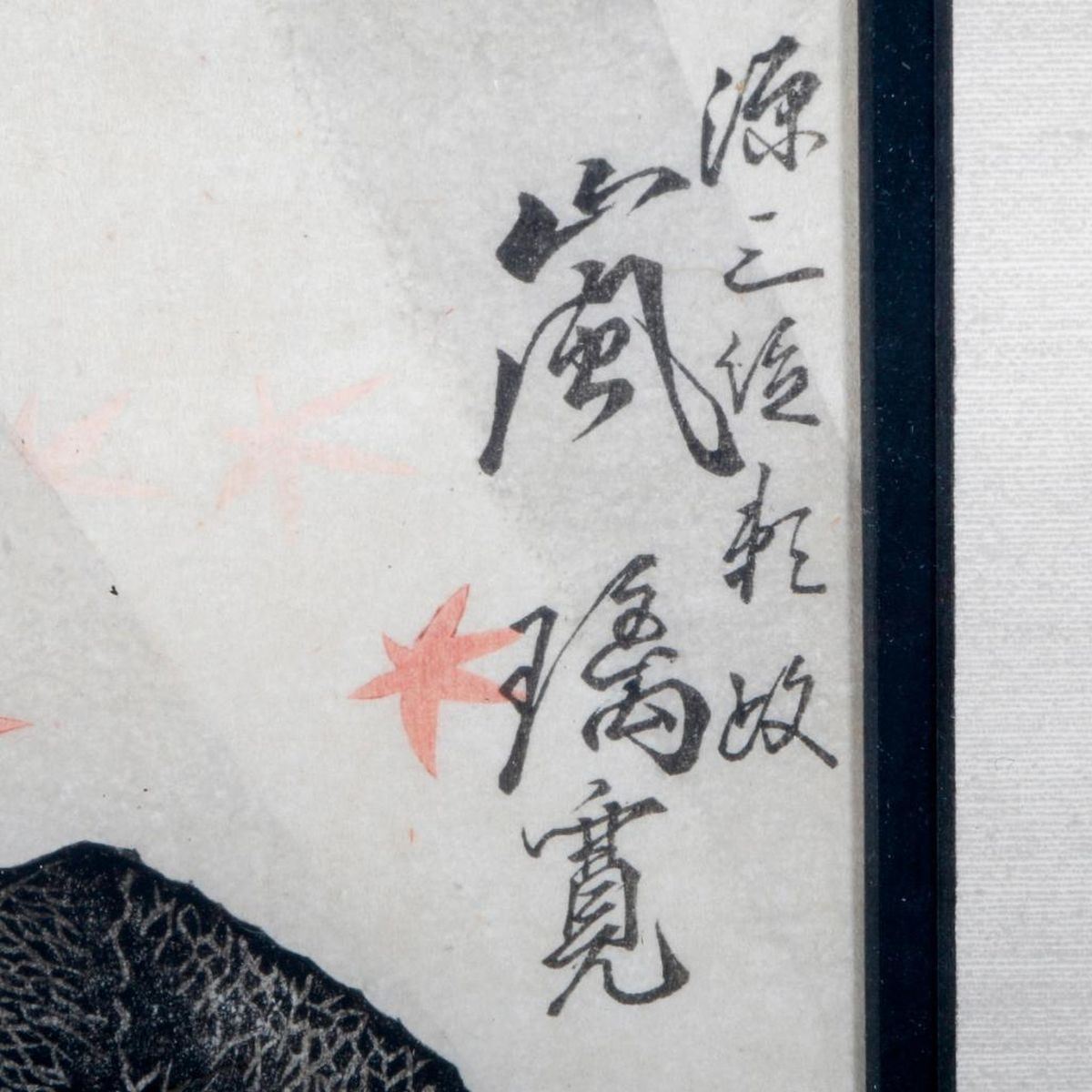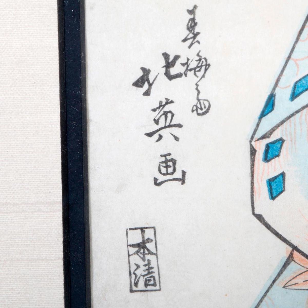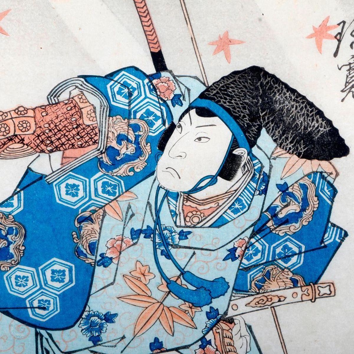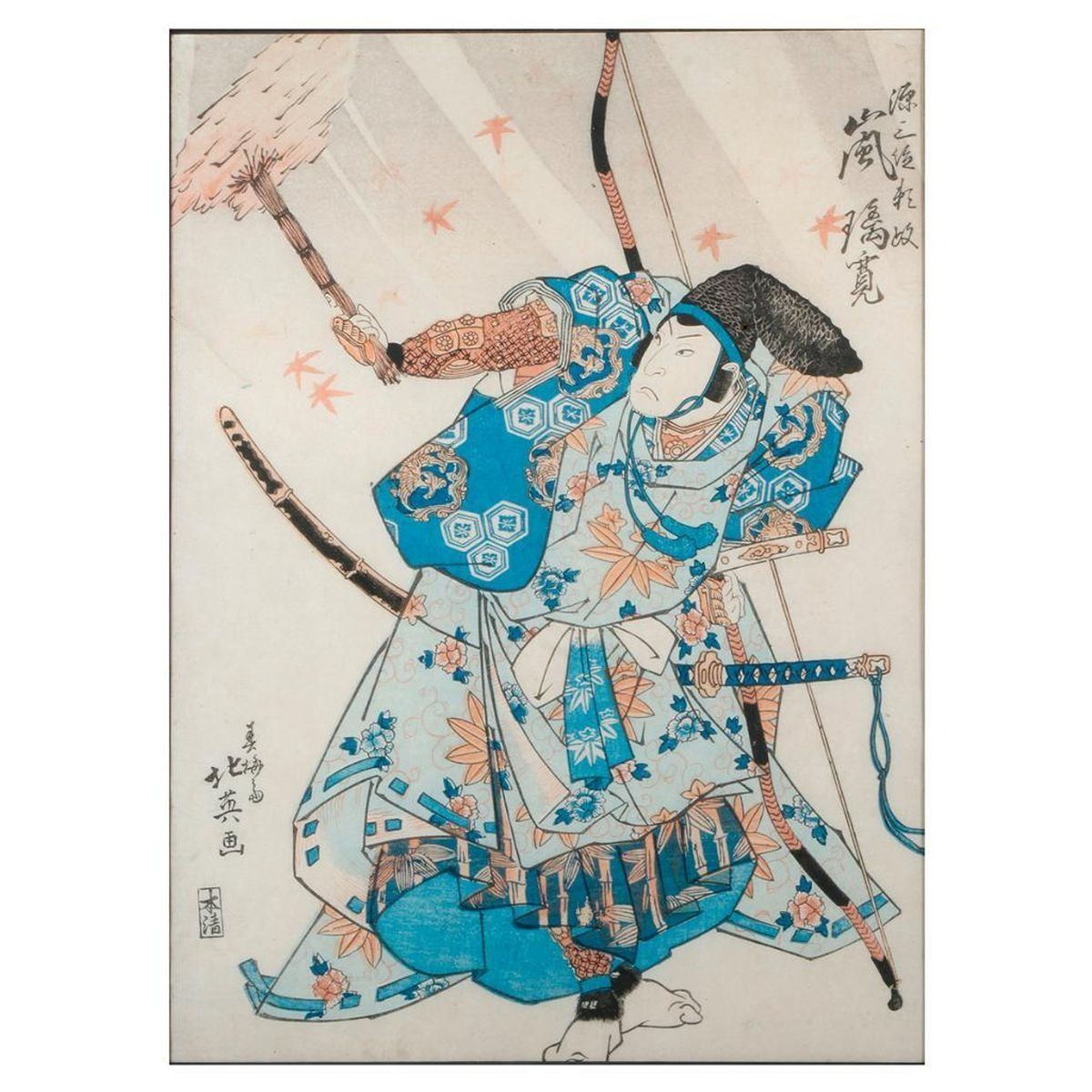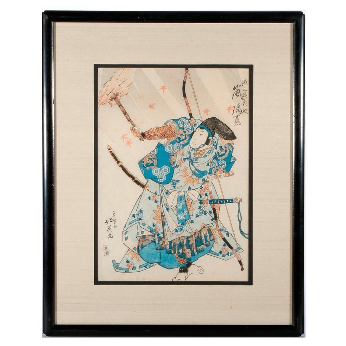 A 19th century Japanese woodblock print of a samurai. Print measures 13 1/2 inches high x 9 1/2. Frame measures: 20 1/2 inches high x 16 1/2.