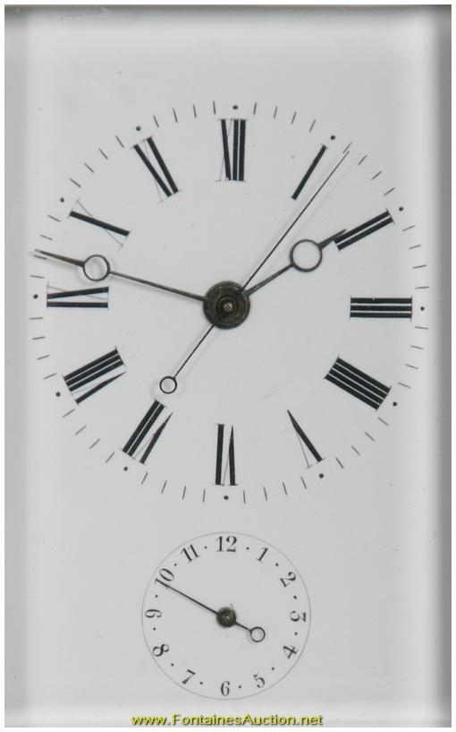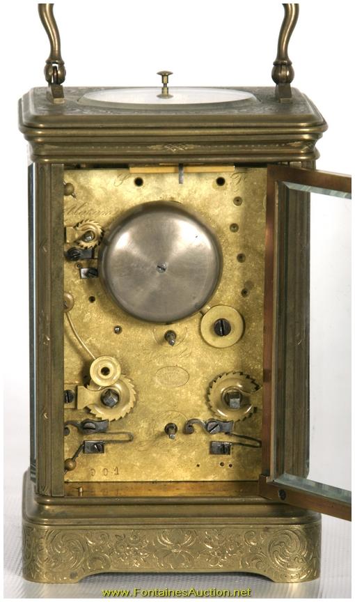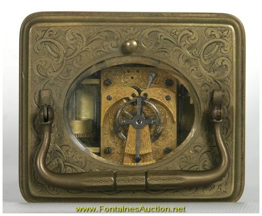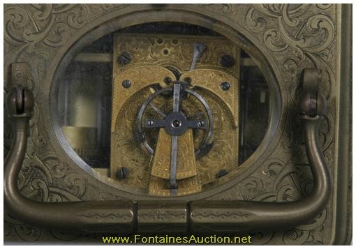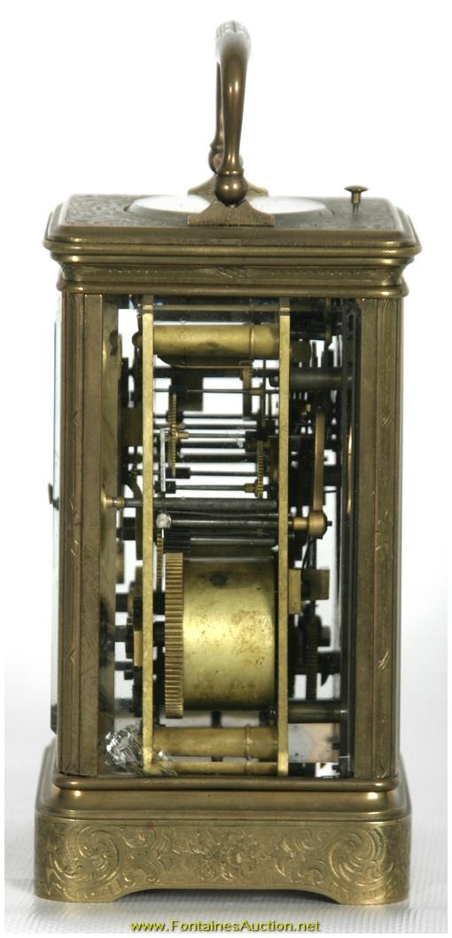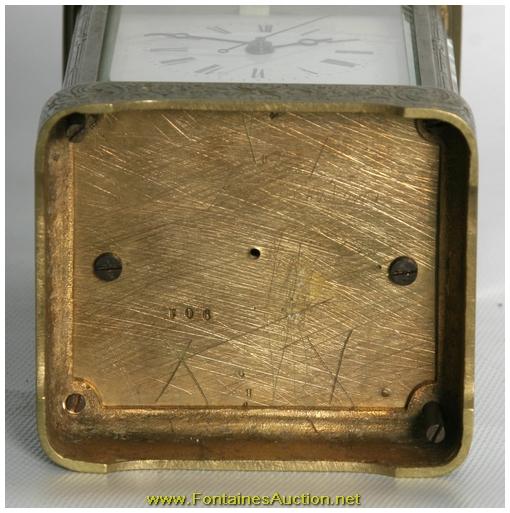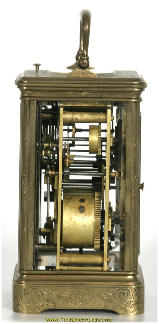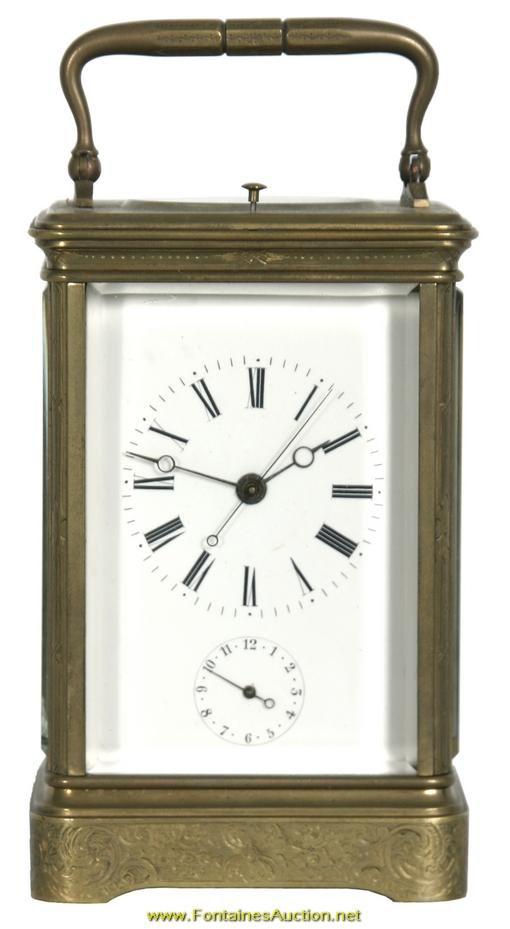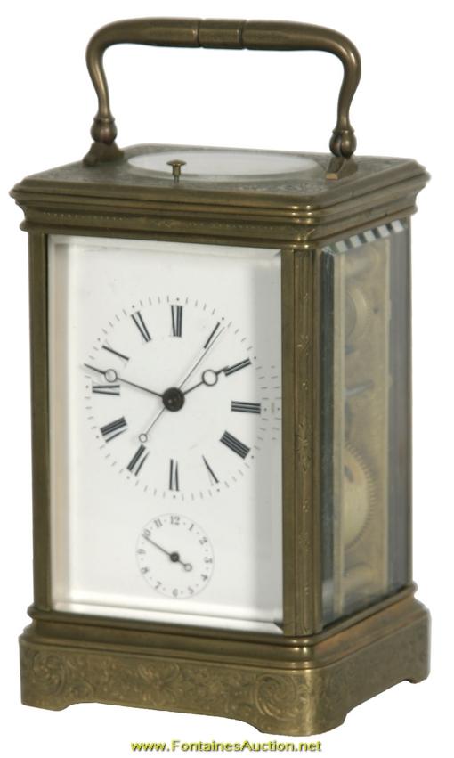 Jappy Freres Repeater Carriage Clock. Fancy etched brass case w/ beveled glasses, exposed escapement through the top and alarm/repeater button. Enameled dial w/ black roman numerals and minute markers on the chapter ring w/ sub-alarm dial and black open moon hands. Quality movement signed "Jappy Freres - Exposition 1855 Grande - Med - Honneur", movement and case numbers "901" are matching; Silvered lever platform escapement w/ fancy etched platform, and rack & snail strike mechanism striking a single bell. All appears to be running, strikes properly and balance has good brisk motion; has small chip on front and right side glasses on a single corner and a larger chip on the left side glass; handle has some light repair and is not solid on the case. 3.75"W x 7.5"H x 3"D. Estimated Value$1,500 - 2,500.