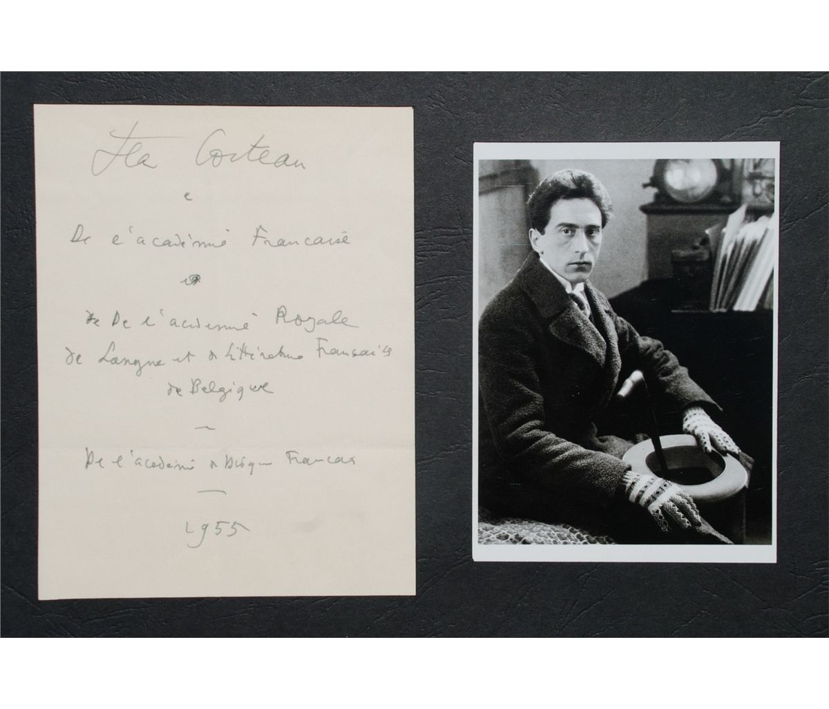 An untranslated ANS in ink signed and dated below 1955.Jean Maurice Eugène Clément Cocteau was a French poet, novelist, dramatist, designer, playwright, artist and filmmaker. Cocteau is best known for his novel Les Enfants Terribles (1929), and the films Blood of a Poet (1930), Les Parents Terribles (1948), Beauty and the Beast (1946) and Orpheus (1949).