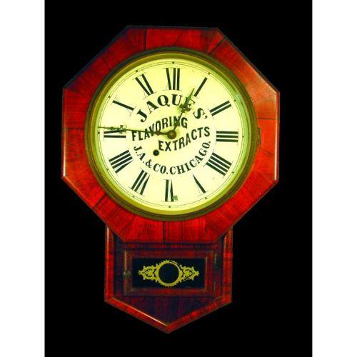 Jaques Flavoring Extracts, Advertising, 8 Day Clock, The New Haven Clock Co., J.A. and Co. Chicago, Mahogany Cabinet, Patented 1871, Overall very good condition, 16 x 14 inches.