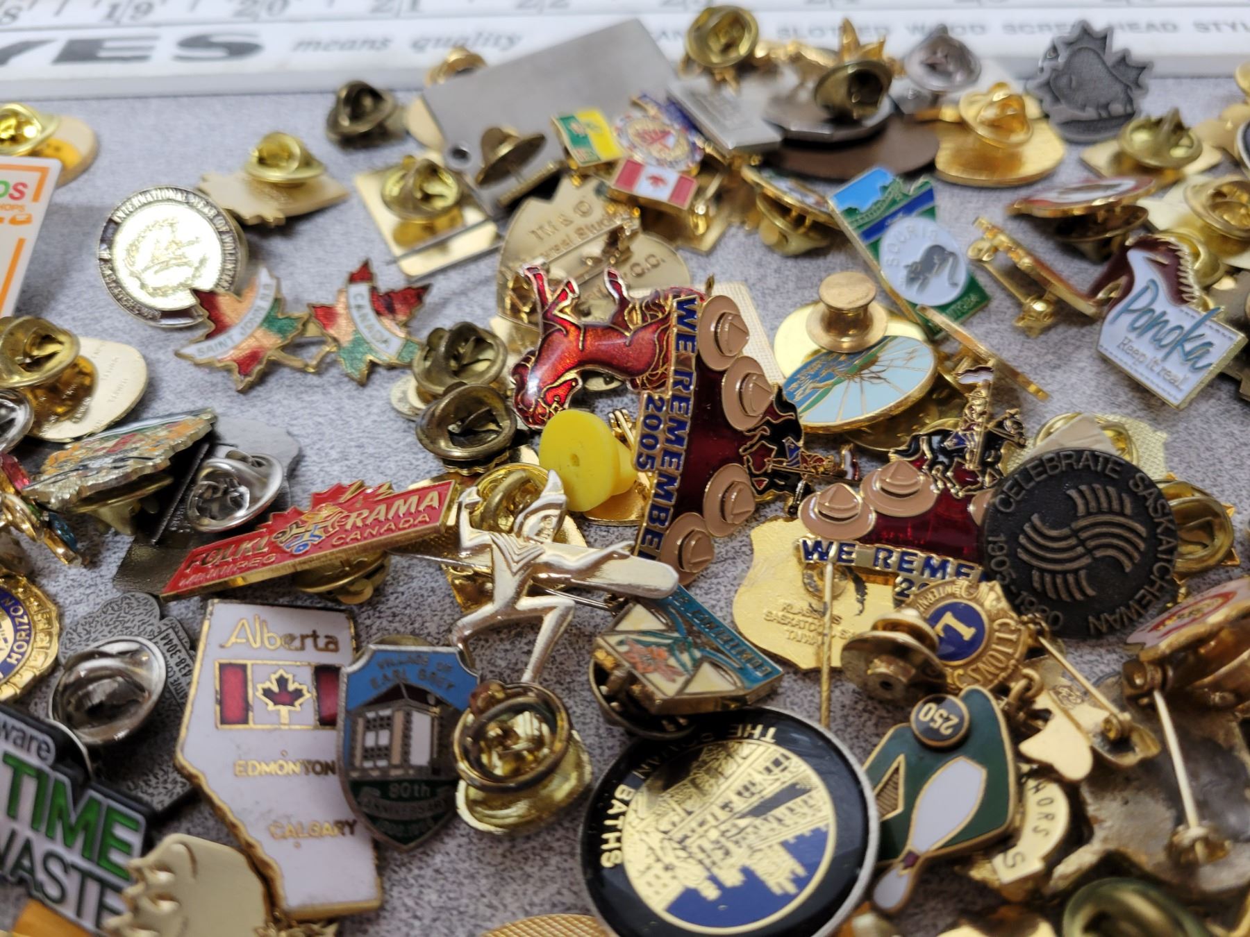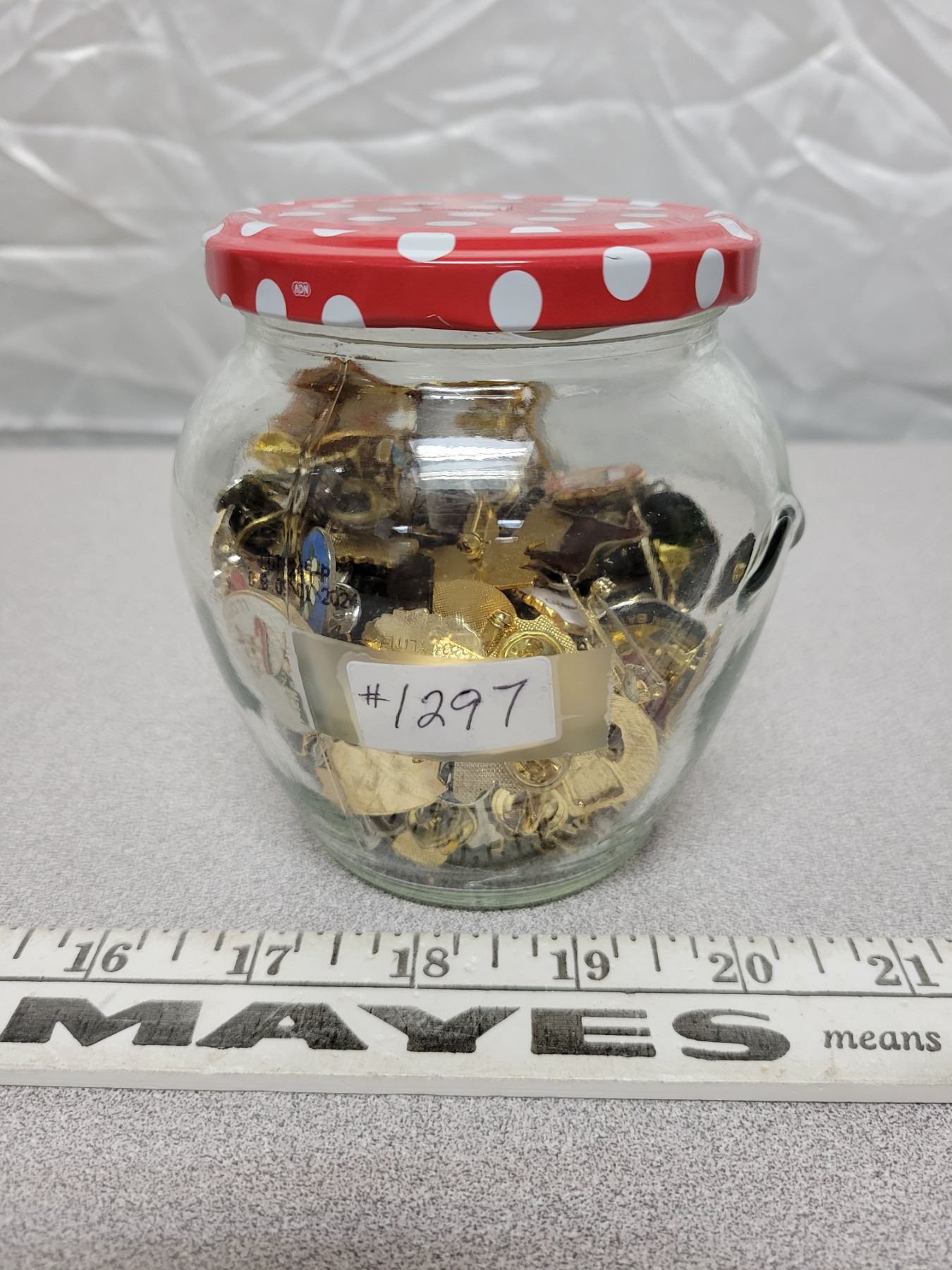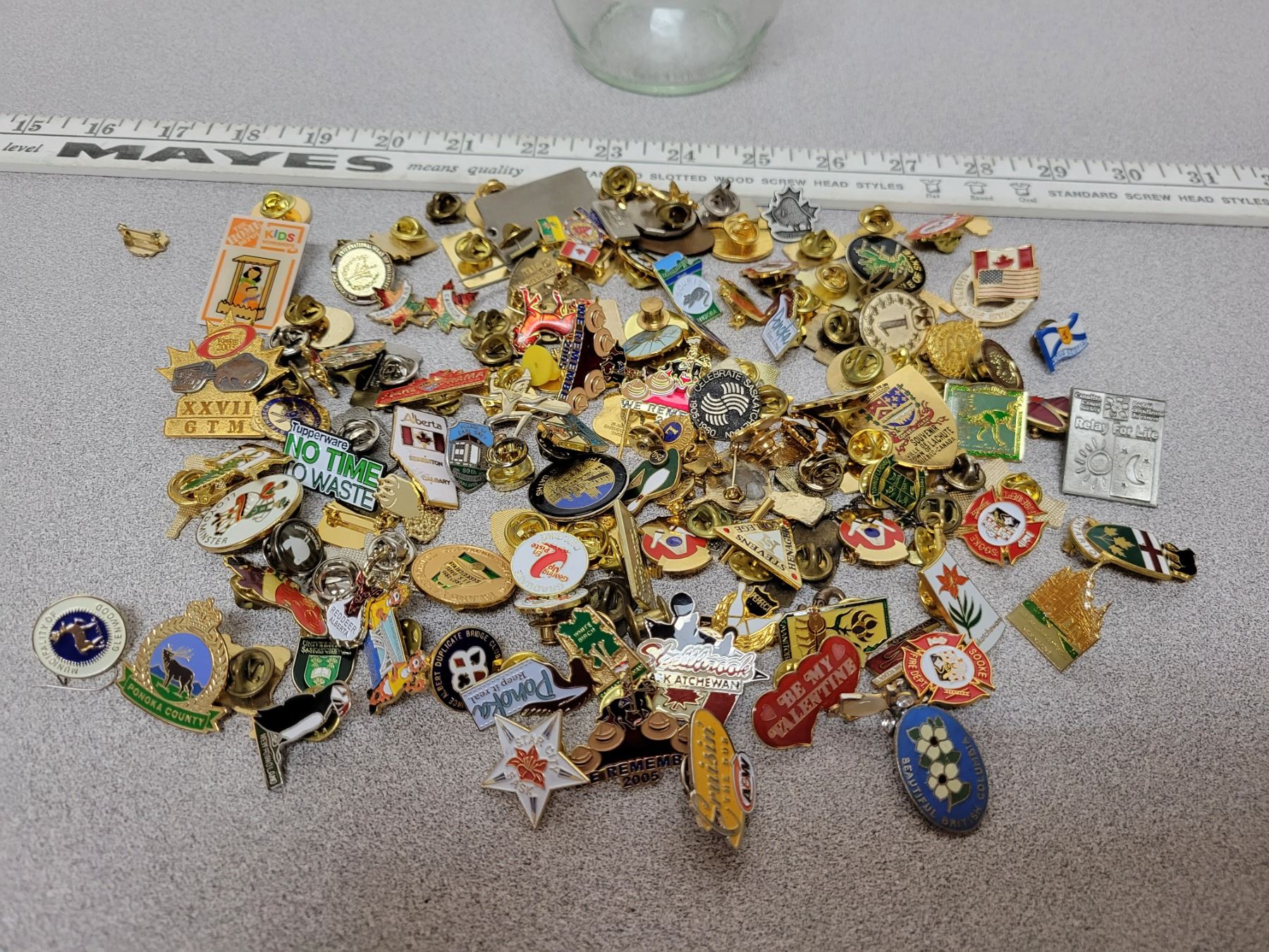 Jar of assorted lapel pins