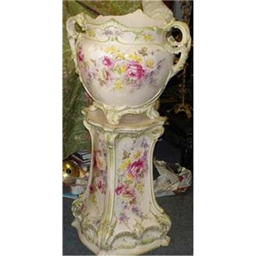 Beautiful PHandpainted Jardinaire on stand, Soft colors on cream background Roses all around. Openwork handles, Large very grand size. A real beauty