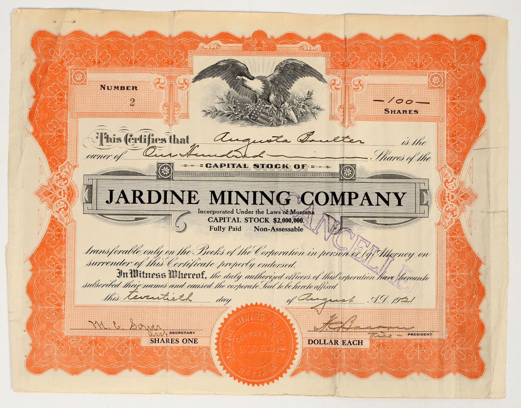 Lowest number in the Shaddrick Collection. Stock number 2, issued to Augusta Boulter for 100 shares in 1921. Signed by the vice president and asst. secretary. Stamp cancelled. Orange border and seal, eagle vignette. Deep folds and creases, tears. The Jardine Mining Company, established in 1917, consolidated mining activity in the area, which had been ongoing since the late 1800s. The town is located near the northern entrance of Yellowstone National Park.
