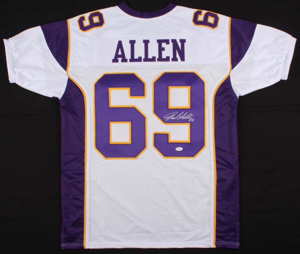 Custom on-field style jersey. Everything is sewn on, size XL. Hand-signed in silver paint by Jared Allen.