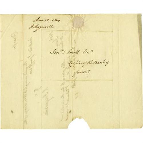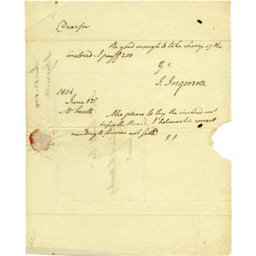 <B>Jared Ingersoll Autograph Letter Signed</B></I> "<I>J. Ingersoll,</B></I>" half-page, 7.75" x 9.75". Philadelphia , June 12, 1804. Addressed on verso by Ingersoll to "<I>Jon Smith Esqr/ Cashier of the Bank of/ Penna.</B></I>" In full, "<I>Be good enough to take charge of the inclosed. I pay $200.</B></I>" Ingersoll has added, "<I>Mr Smith…please to lay the inclosed and before the Board - I believe it is correct…</B></I>" Jared Ingersoll, a signer of the Constitution, was the first Attorney General of Pennsylvania (1790-1799, 1811-1817) and the unsuccessful Federalist candidate for Vice President in 1812. In 1798, $162,821 was taken from the vaults of the Bank of Pennsylvania. Blacksmith Patrick Lyon had recently changed fittings and locks on two iron vault doors at the bank and he was arrested and imprisoned for three months. Someone else then confessed and returned all but $2000, but Lyon remained in jail for several weeks. In 1805, Lyon sued officers of the bank, including chief bank cashier Jonathan Smith who was sure of Lyon's guilt, and that he had made an extra key. Smith had vowed to keep him in jail. Jared Ingersoll was one of Smith's lawyers. The jury returned with a verdict awarding $12,000 to the blacksmith for false imprisonment. To avoid an appeal and retrial, Lyon accepted $9,000. There is light show-through of Ingersoll's writing and a portion of the paper was removed at the right edge when it was opened at the seal. Overall, in fine condition.<BR><BR><b>Shipping:</b> Flat Material, Small (<a target="_blank" href="http://www.heritageauctions.com/common/shipping.php">view shipping information</a>)