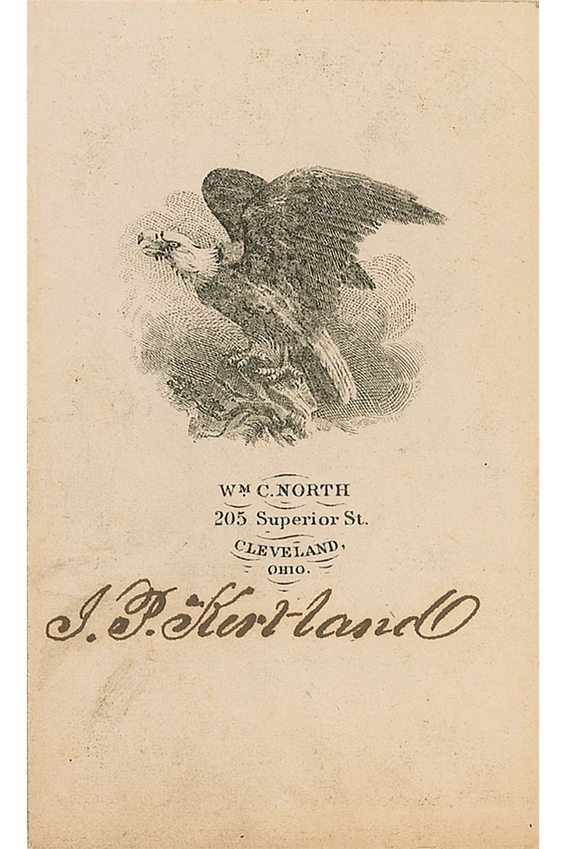 Naturalist and politician (1793–1877) who was active in Ohio’s state government and founded Western Reserve University's medical school. Original 2.25 x 4 carte-de-visite bust portrait of Kirtland, by William C. North of Cleveland, signed on the reverse black ink, “J. P. Kirtland.” Light scattered surface marks and foxing, otherwise fine condition.