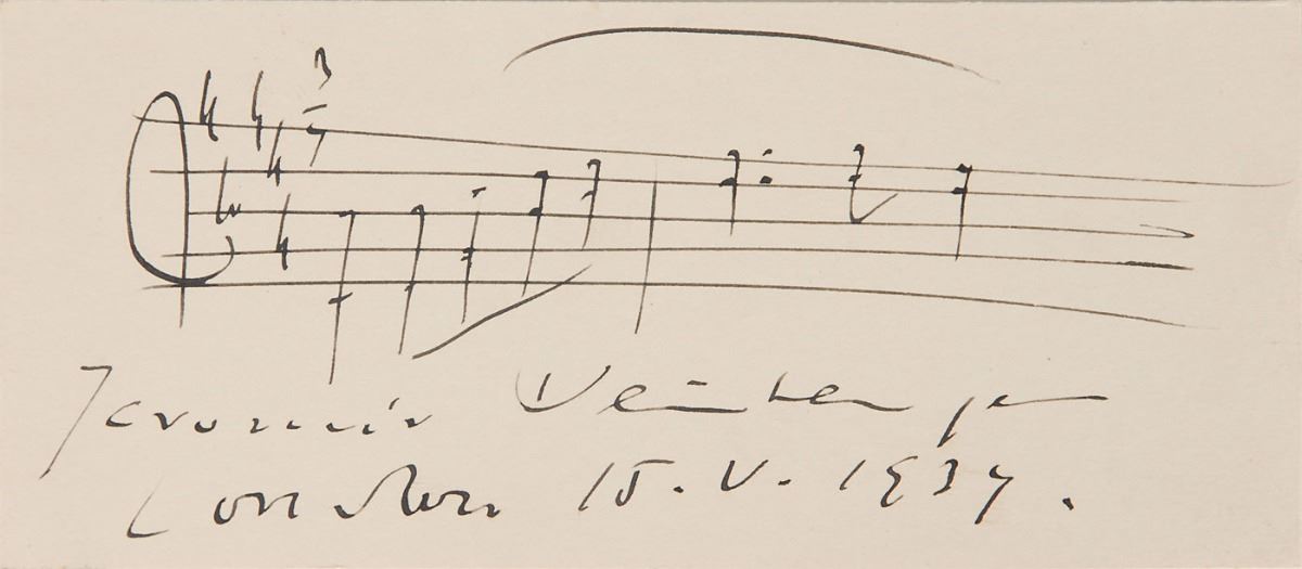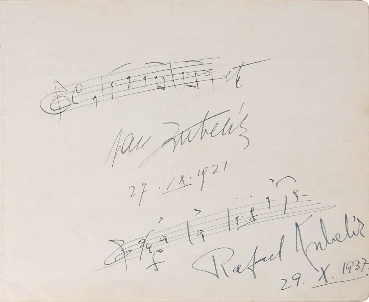 Nice grouping of AMQSs: one by Jaromir Weinberger on an off-white card, featuring the first two bars of the polka from Svanda Dudak; and an off-white album page featuring a three-bar AMQS by Jan Kubelik and a four-bar AMQS by Rafael Kubelik. In overall fine condition.