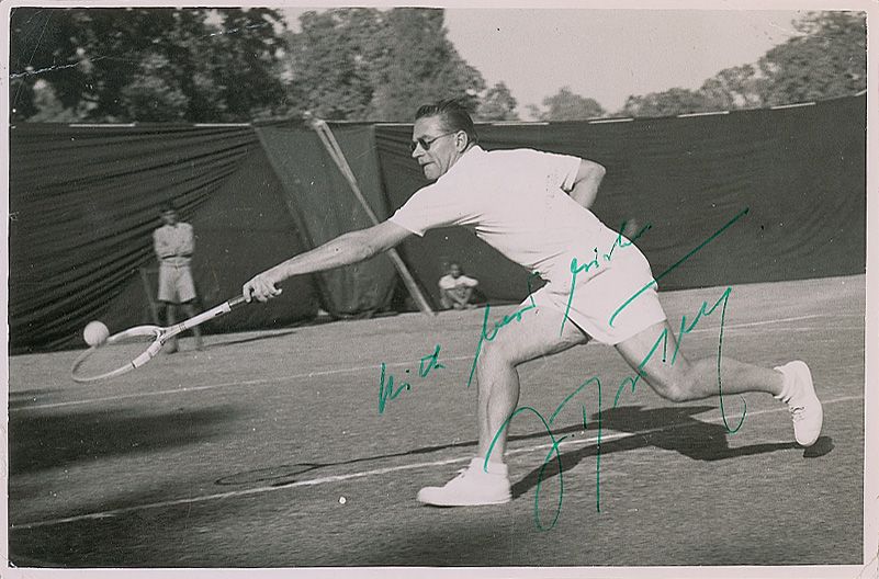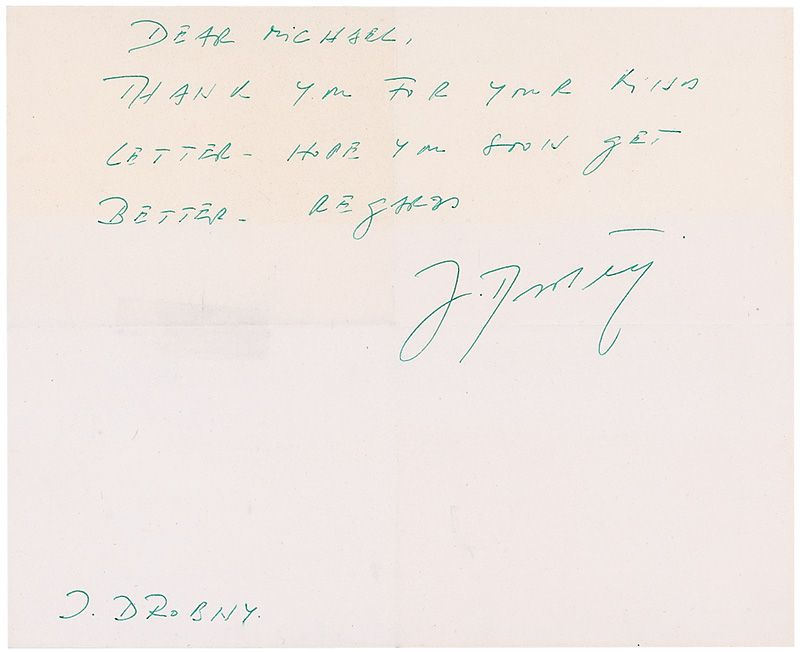 Multi-sport athlete (1921–2001) who was a 1948 Olympic hockey medalist as well as a 1954 Wimbledon champion. Two items: one glossy 6.25 x 4.25 photo of Drobny during a tennis match, signed in green ink “With best wishes, J. Drobny”; and an ALS signed “J. Drobny,” one page, 8 x 6.5, no date, expressing hope that a fan gets well soon. In fine condition, with scattered creases, impressions and irregularly trimmed edges to the photo.