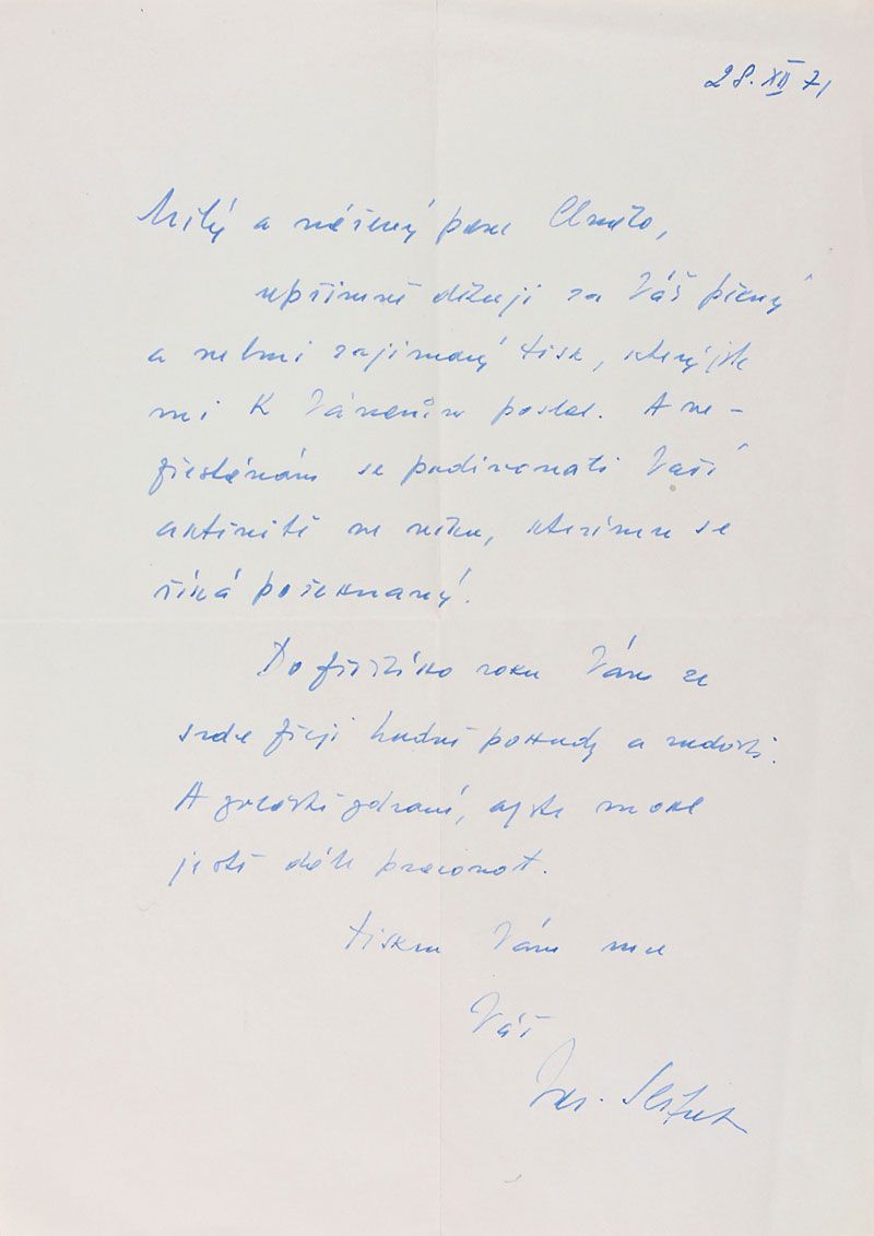 Czech writer, poet, and journalist (1901–1986) who was awarded the Nobel Prize in Literature in 1984. ALS in Czech, signed “Jar. Seifert,” one page, 8.25 x 11.75, December 28, 1971. Letter to a publisher. In part (translated): “Thank you very much for your very nice and very interesting print you sent me before Christmas. I really admire you, your vitality in your advanced age.” In fine condition, with central vertical and horizontal folds.