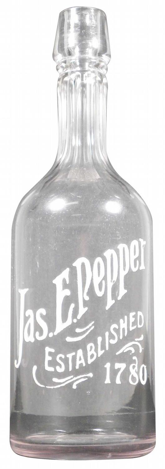 Jas. E. Pepper Enameled Label Whiskey Bottle. Fluted neck and shoulders. No chips or cracks. 11 1/4 inches tall.