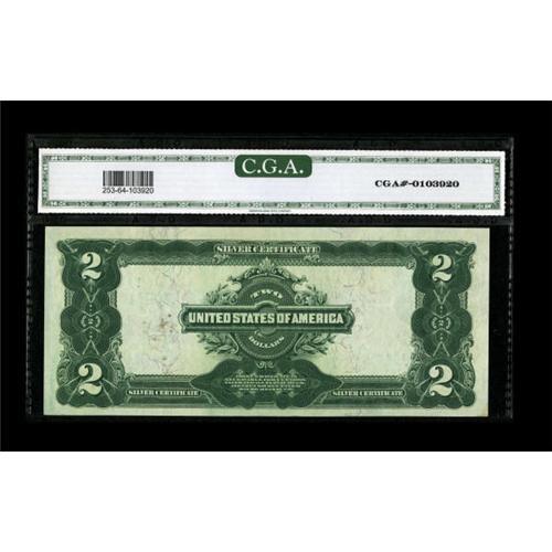 <B>Jas. Gilfillan Courtesy Autograph Fr. 253 $2 1899 Silver Certificate CGA Choice Uncirculated 64.</B></I> This is one of only four documented notes in the census with Gilfillan's autograph for this Friedberg number that has the engraved signatures of Napier-McClung. Embossing is noticed on this nicely preserved note.<BR><BR><b>Shipping:</b> Coins & Currency (<a target="_blank" href="http://www.heritageauctions.com/common/shipping.php">view shipping information</a>)