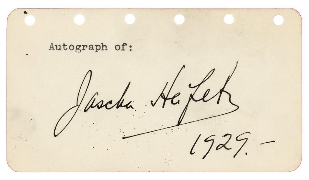 Bold vintage fountain pen signature, "Jascha Heifetz, 1929," on an off-white 4.5 x 2.5 sheet. In fine condition.