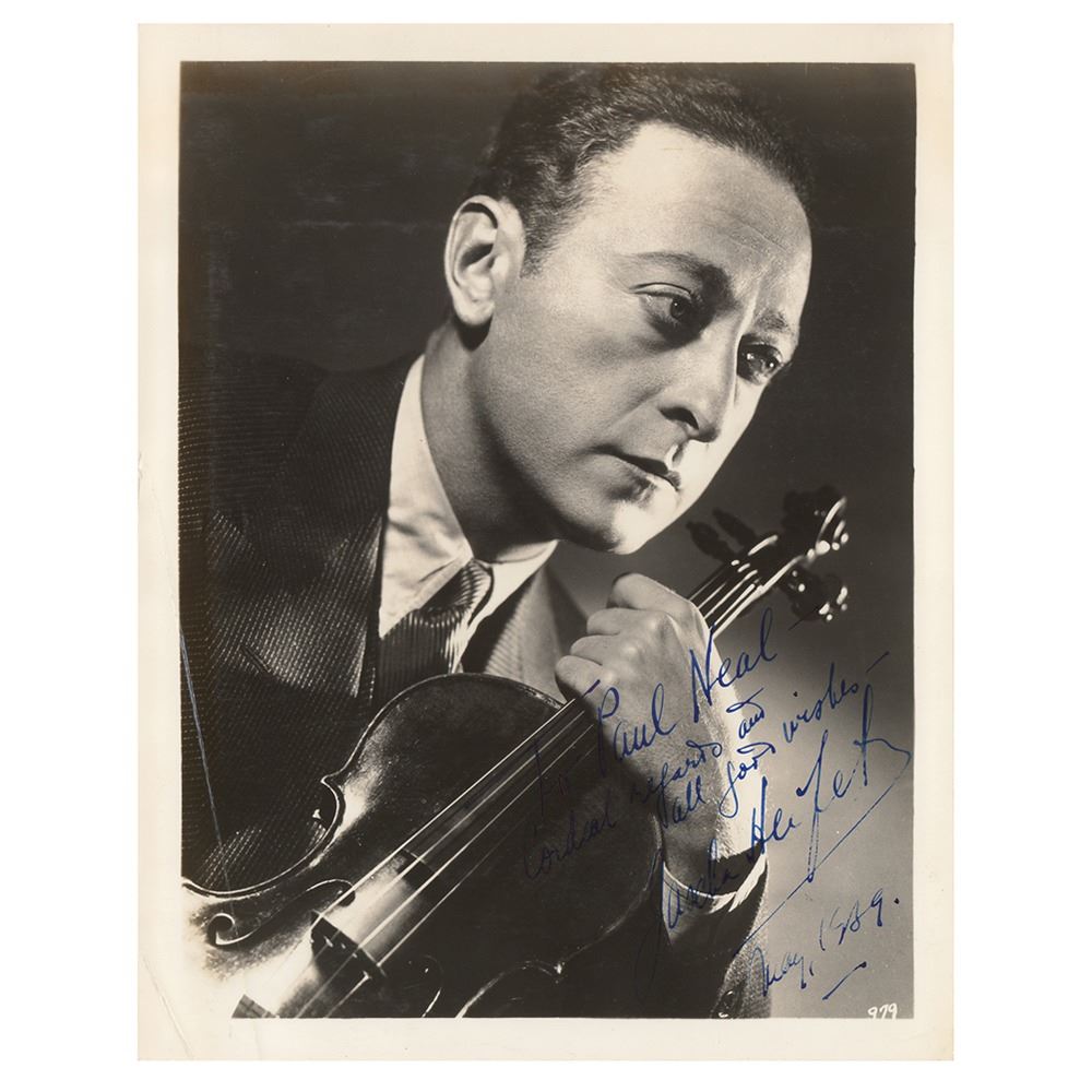 Well-composed vintage glossy 8 x 10 photo of Heifetz posing with his violin, signed and inscribed in fountain pen, "To Paul Neal, Cordial regards and all good wishes‰ÛÓJascha Heifetz, May 1939.‰Û In very good condition, with silvering to the edges, and two creases to the lower left.