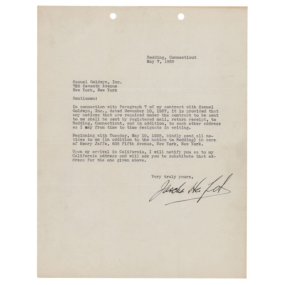 TLS from Jascha Heifetz, one page, 8.5 x 11, May 7, 1938. Letter to Samuel Goldwyn, Inc., seeking to amend a contract from November 10, 1937, that originally sent all mail notices to Heifetz’s address in Redding, Connecticut. In part: “Beginning with Tuesday, May 10, 1938, kindly send all notices to me (in addition to the notice to Redding) in care of Henry Jaffe, 608 Fifth Avenue, New York, New York. Upon my arrival in California, I will notify you as to my California address and will ask you to substitute that address for the one given above.” In fine condition.