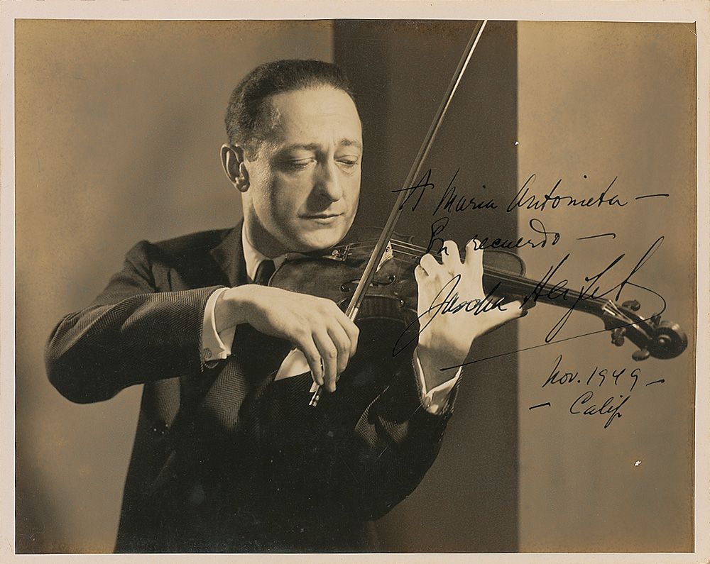 Vintage pearl-finish 10 x 8 photo of Heifetz in deep concentration as he bows his violin, signed and inscribed in fountain pen “A Maria Antonieta—Por recuerdo, Jascha Heifetz, Nov. 1949, Calif.” A crease to the upper right corner, some irregular toning, a tiny spot of surface loss to the right side, silvering to the borders, and a lightly trimmed right edge, otherwise fine condition. A scarce, boldly signed photo of one of the premier violinists of the 20th century.