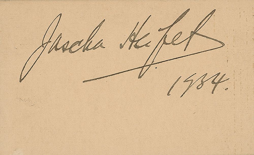 Vintage fountain pen signature, “Jascha Heifetz, 1934,” on an off-white 3.5 x 2.25 album page affixed to a same-size mount. In fine condition.