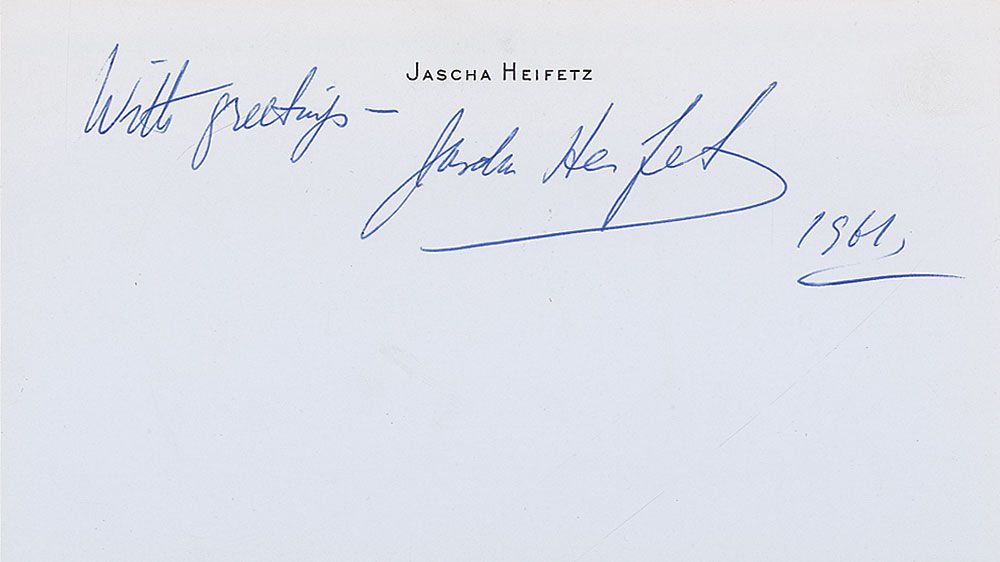 Ballpoint signature, “With greetings—Jascha Heifetz, 1961,” on an off-white 7 x 4 personal stationery card. In very fine condition.