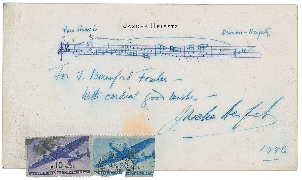 Scarce AMQS on an off-white 6.75 x 4 personal stationery card, signed and inscribed in blue ink, “For J. Beresford Fowler—With cordial good wishes—Jascha Heifetz, 1946.” Heifetz pens ten bars of fast-paced staccato music from one of his works. In very good condition, with old mounting remnants on the reverse and light moisture-related staining to the front. The first Heifitz musical quotation we have ever offered.