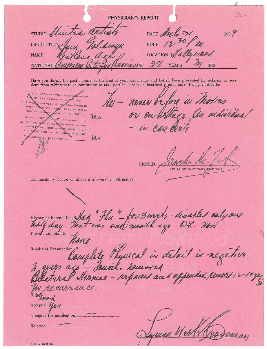 DS, one page, 8.25 x 11, March 31, 1939. A United Artists physician’s report concerning a case of the flu from a month prior, signed and initialed by Heifetz. In fine condition.