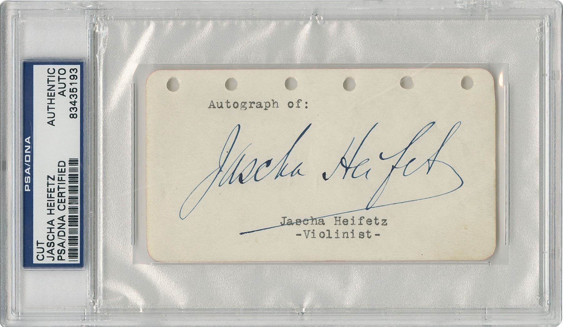 Vintage fountain pen signature, "Jascha Heifetz,” on an off-white 4.5 x 2.5 album page with typed collector's notations. In fine condition. Encapsulated in a PSA/DNA authentication holder.