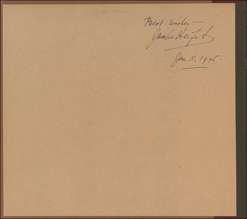 Richard Strauss: Sonata in E Flat Major for Violin and Piano four-album set in a presentation book, signed in black fountain pen on the inside cover, “Best Wishes– Jascha Heifetz Jan. 11, 1945.” In fine condition, with some separation along the spine and the first letter of the inscription traced over by Heifetz. The records are included; the fourth disc has a piece broken off its edge (still present). RRAuction COA.