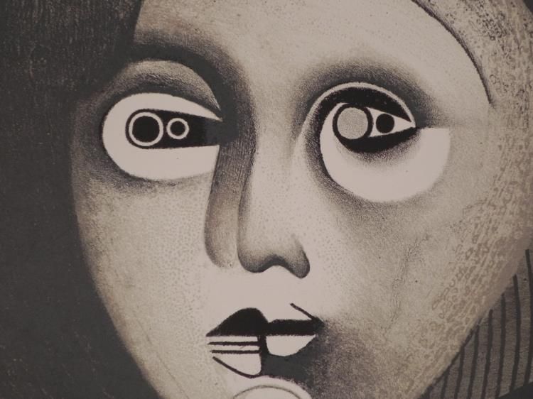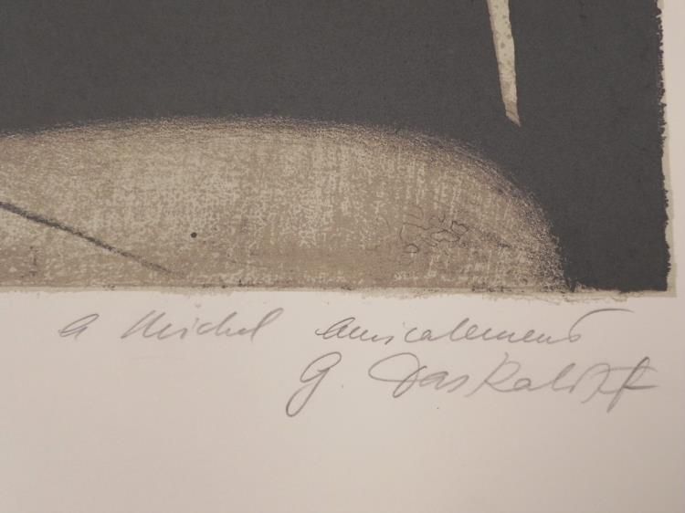 This portrait is in the Cubist style, with engaging eyes, and shading and shawdows providing an air of mystery. Artist: Jaskoloff Signature: In pencil, lower right Medium: Lithograph on rag paper with deckled top and bottom edges Edition: Unnumbered, dedicated artist's proof, marked lower left "e.a.", and lower right "A Michel..." Sheet size: 30 x 22 1/2 inches Condition: Excellent