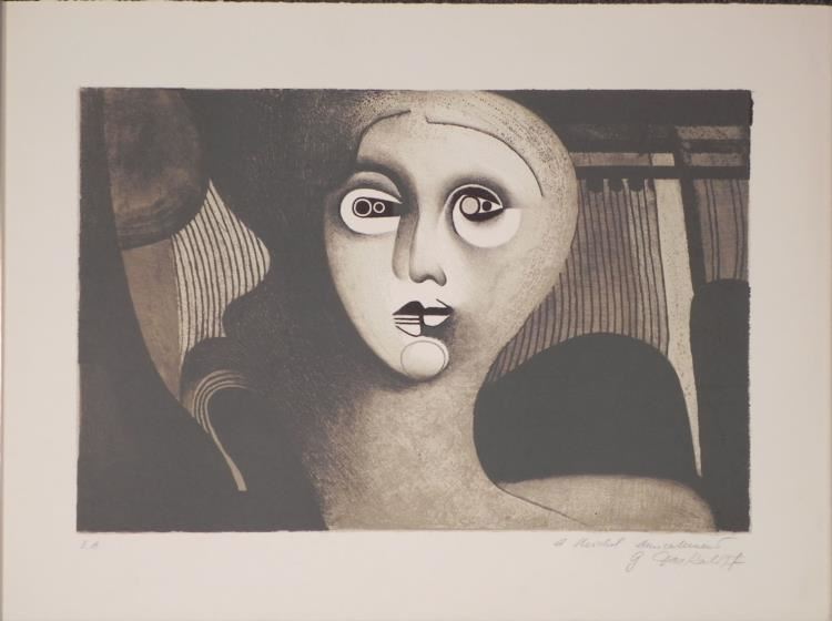 This portrait is in the Cubist style, with engaging eyes, and shading and shawdows providing an air of mystery. Artist: Jaskoloff Signature: In pencil, lower right Medium: Lithograph on rag paper with deckled top and bottom edges Edition: Unnumbered, dedicated artist's proof, marked lower left "e.a.", and lower right "A Michel..." Sheet size: 30 x 22 1/2 inches Condition: Excellent