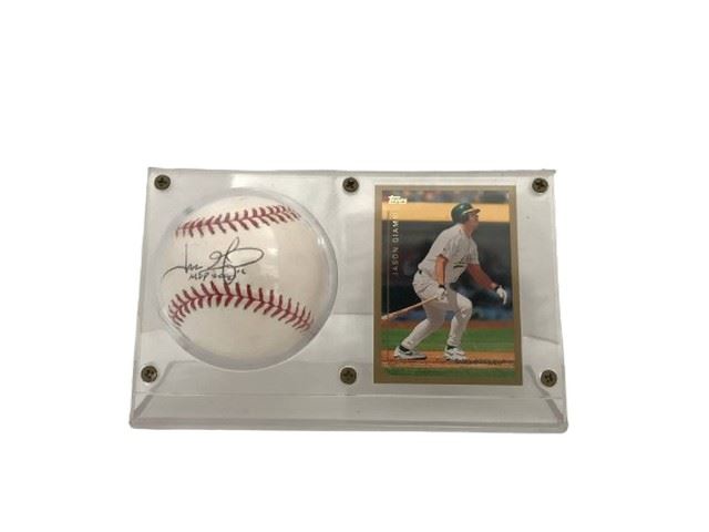 Oakland Athletics’ Jason Giambi autographed Rawlings baseball and Topps trading card.