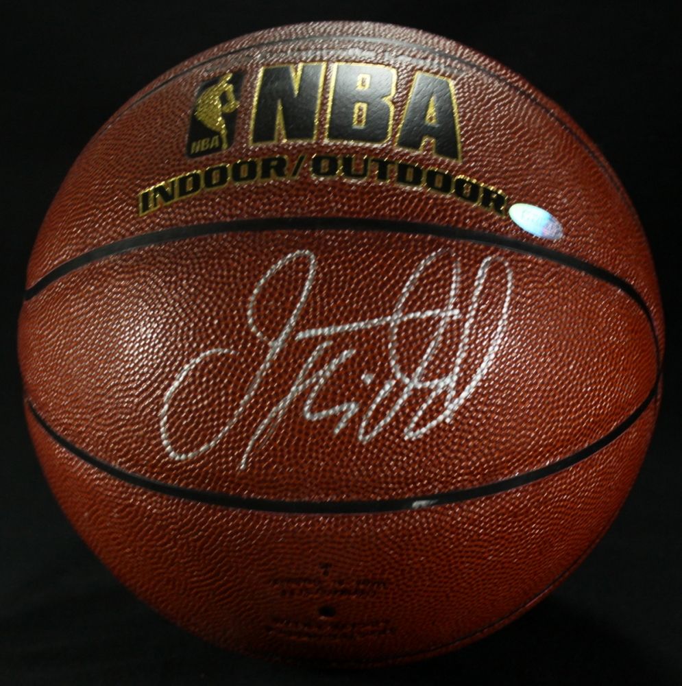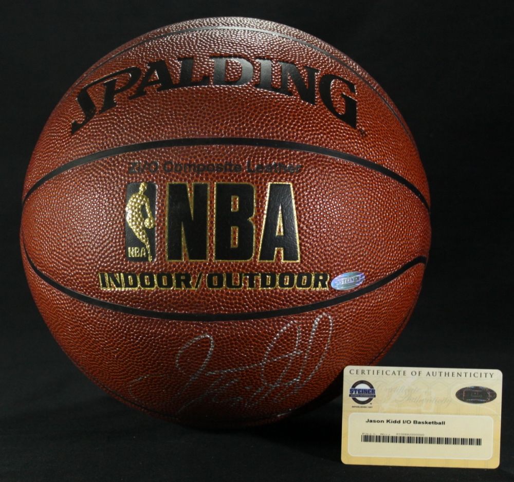 Full-size Spalding basketball hand-signed in silver paint-pen by Jason Kidd. The autograph includes a Steiner hologram and matching COA for authenticity purposes.