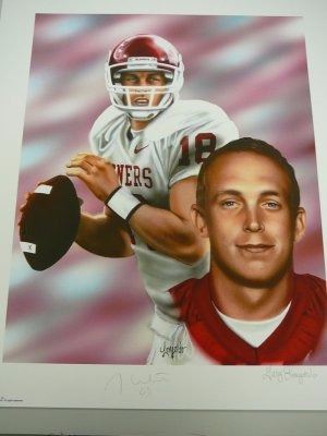Jason White won the Heisman Trophy at Oklahoma in 2003 after throwing 40 touchdown passes and 8 interceptions. White was also the recipient of the Associated Press Player of the Year, consensus All-American, consensus Big 12 Offensive Player of the Year, the Davey O'Brien Award and the Jim Thorpe Courage Award in his 2003 season. He was also the 2003 NCAA QB of the Year as awarded by the Touchdown Club of Columbus. Jason White has hand autographed this Oklahoma Sooners 20x24 Lithograph with '03 inscription in pencil at the bottom of the piece. Certificate of Authenticity from Athlon Sports.